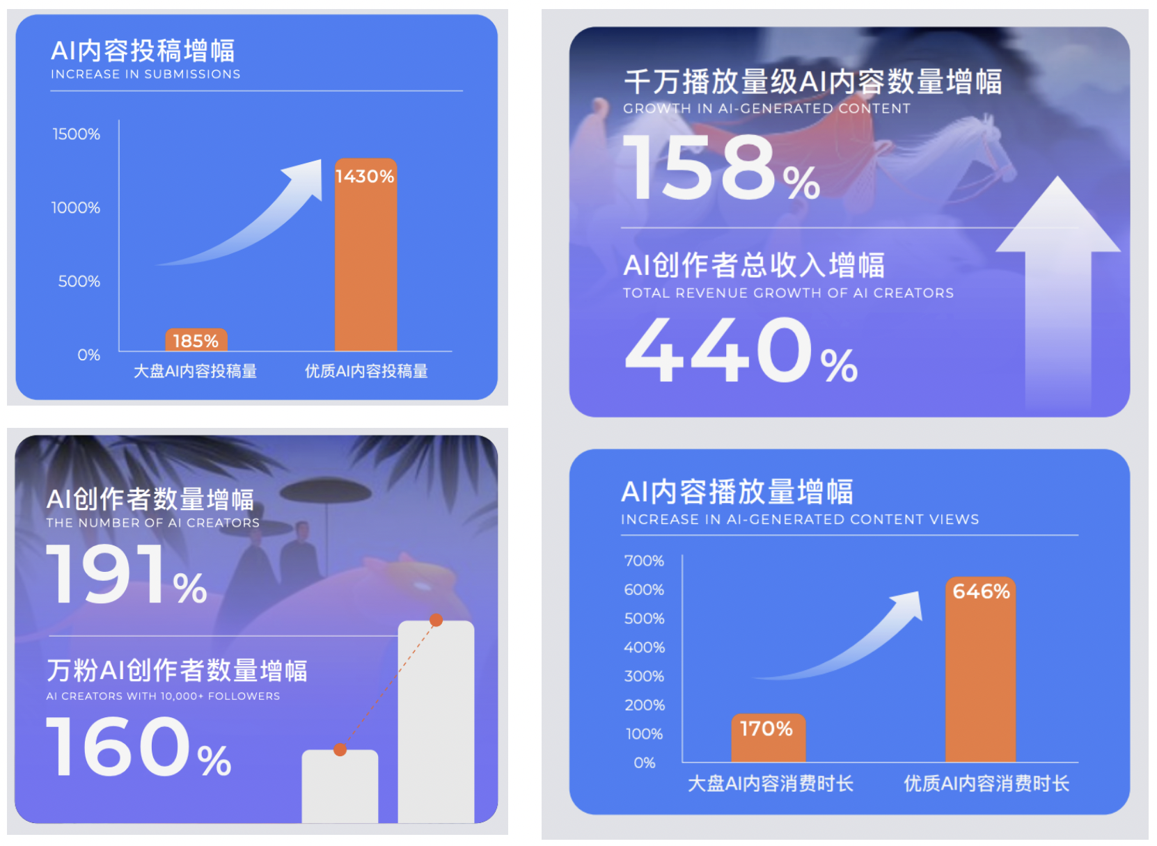 整体上,报告数据显示,2025 年 11 月对比 3 月,平台 AI 内容投稿量增长 185%。其中,优质 AI 内容投稿量飙升 1430%,播放量涨幅达 478%,生态规模深度渗透。