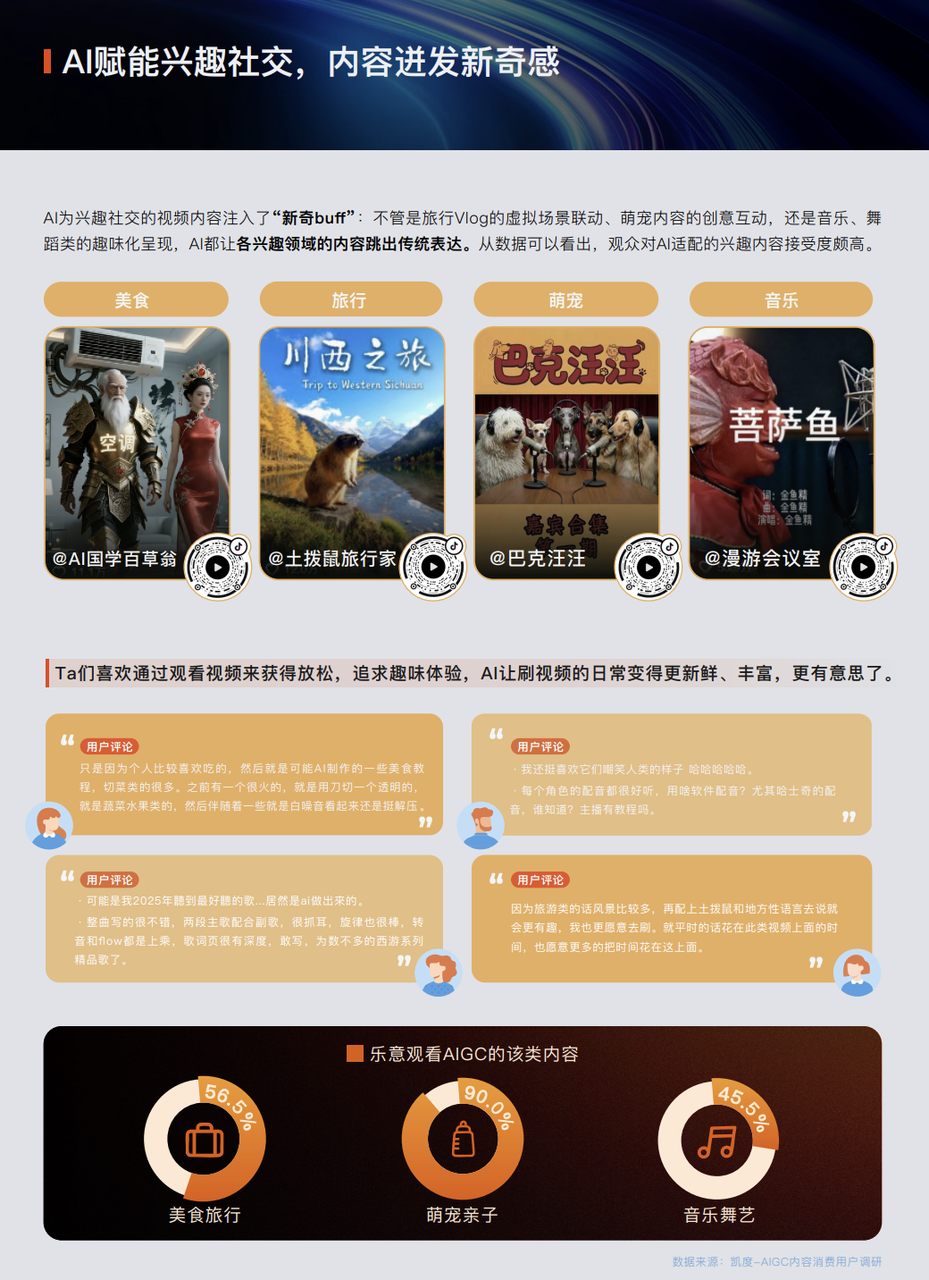 与此同时,AI 技术也在融入社交平台的内容生产环节,各垂直领域的内容创作正经历从「规模增长」到「体验重构」的转变。一方面,AIGC 工具的普及使普通人也能高效产出优质视频,持续夯实平台内容供给基础。另一方面,AI 带来的创作效率与形态创新,吸引了不同背景的创作者加入,从知识传递、文娱体验、兴趣社交等细分领域激活内容多样性。