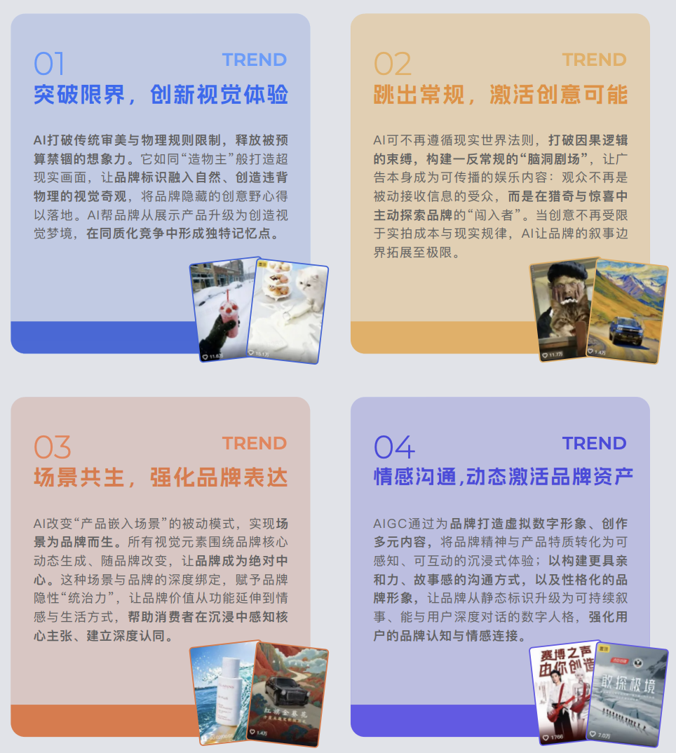 此外,当 AI 深度融入平台的内容生态,多元场景内容在抖音实现深度交融与协同共进,平台的价值传递机制正经历结构性升级。随着 AIGC 技术的成熟并深度融入营销领域,品牌内容的传达也经历了从依赖「人海战术」的传统达人模式,转向由「智能创意」驱动的「人机协同网络」。