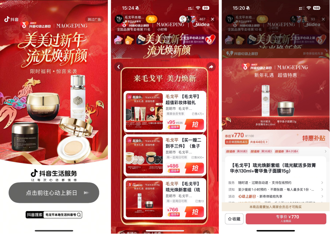 而回溯这一轮上新营销,我们发现,作为首个与「抖音心动上新日」合作的美妆品牌,毛戈平品牌在此次项目中探索了一条不同于以往的上新路径:通过联动线下门店体验,拓展产品在多元生活场景中的呈现方式,将线上内容流量逐步承接至线下到店体验与实际成交,也为高端美妆在本地生活服务平台上的运营方式,打开了差异化上新的思路。