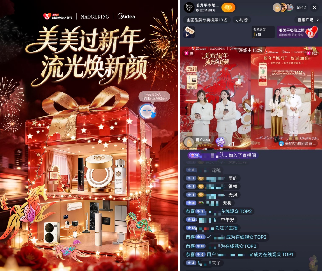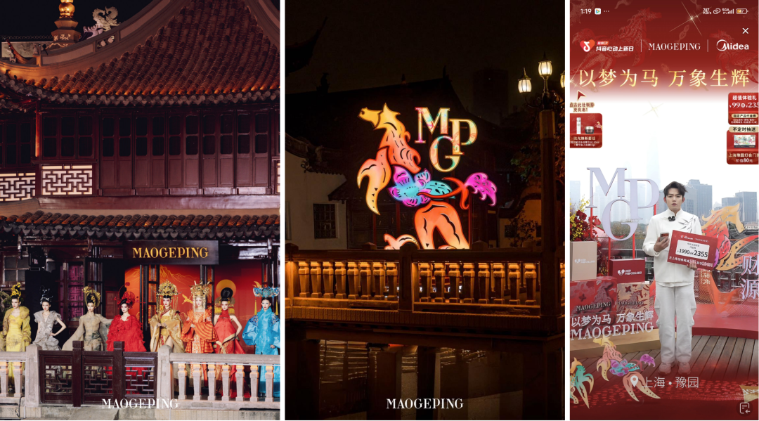 创新跨界带来话题热点,但毛戈平品牌并不止于流量,而是与美的品牌及抖音生活服务平台一同,以场景化直播创新,将双方于福州和上海豫园两地打造的「美美过新年」快闪活动搬到了线上,让线上传播、线下体验以及全域渠道形成真正意义上的联动,不仅放大了整体上新声量,也打破了用户对美妆上新常规带货直播的固有印象,实现品牌双向破圈,触达更多目标人群。