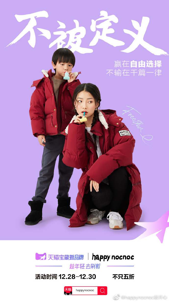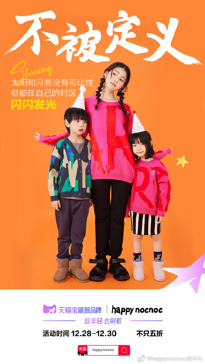 近日,天猫宝藏新品牌携手服饰品牌 happynocnoc 敲开心带来一则广告短片,传递「自由自信不设限」的态度。短片中,happynocnoc 借用自身品牌服饰的颜色,打破性别定义颜色的刻板印象,主张每个孩子都应做独立的个体,拒绝束缚,并发出「不被定义,出色出彩」的品牌倡议。此外,12 月 28 日至 12 月 30 日期间,上手淘搜索「happynocnoc」,可获得折扣抽奖福利。[SocialBeta 报道]