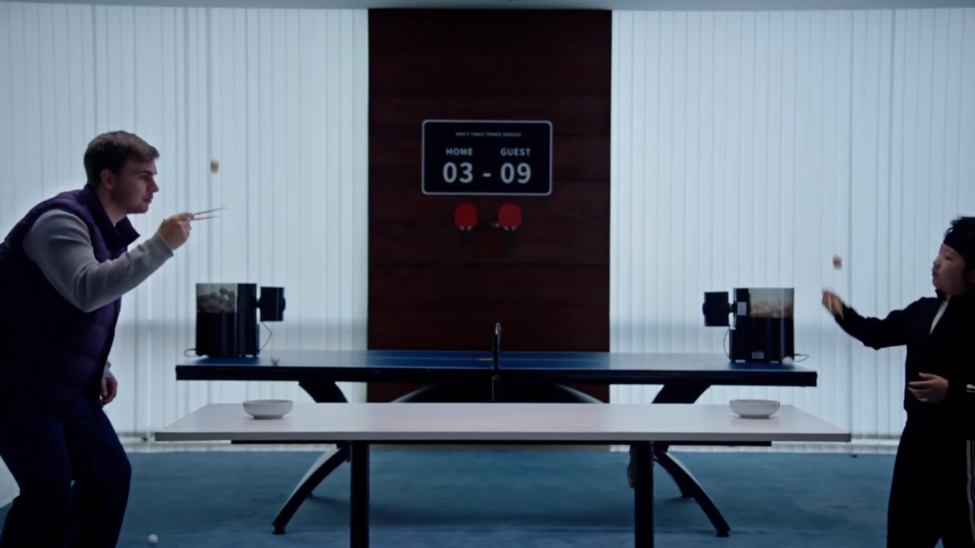 第二站「午餐对决」,当大家熟悉的乒乓球颠球变成筷子颠牛肉丸,衣服难免会遭遇汤汁溅洒,还好 PUFFTECH 空气棉服抗湿易清洗,让人心服口服。