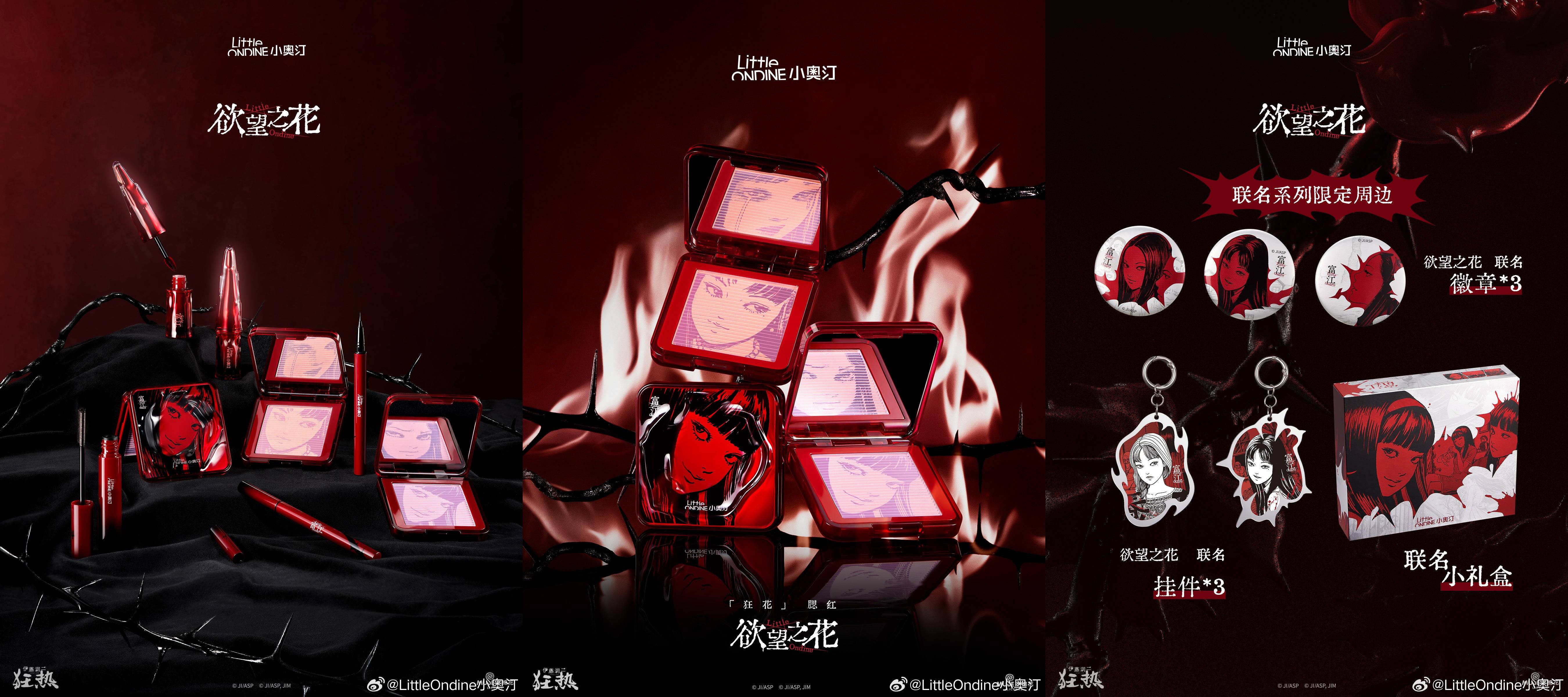 此次联动涵盖多款产品,包括腮红、水唇泥、睫毛膏、眼线笔等,除了在包装设计上紧扣主题外,部分细节也融入了许多小巧思,例如最为出圈的「狂花」腮红,巧妙利用立体浮雕工艺和镜子映射,打造双面富江形象。不仅如此,品牌还推出了全套 all in 礼盒,满足消费者不同的需求的同时,也打造了收藏级的限定周边——挂件、徽章、丝巾、折扇等,消费者购买对应产品即可拥有,一起随欲而妆、独占一色。[SocialBeta]