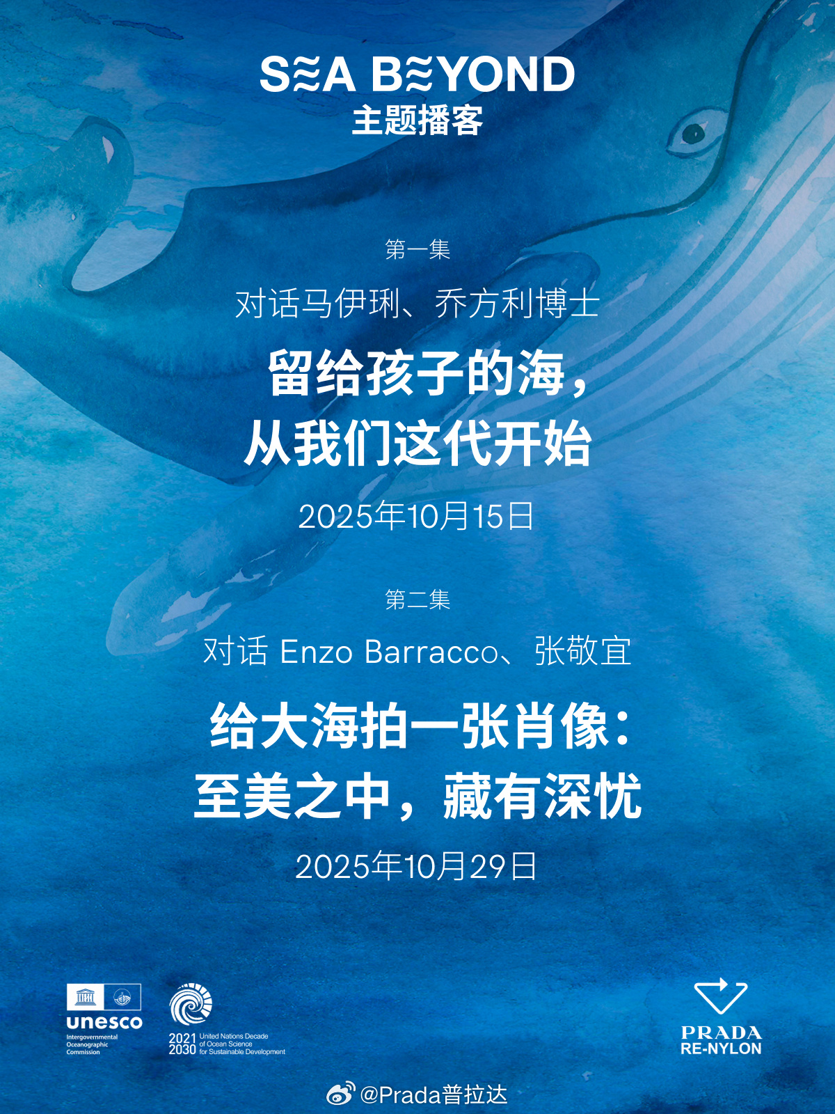 与此同时,Prada 也推出了「SEA BEYOND」主题播客,延续对海洋的思考。节目邀请了马伊琍、乔方利博士、生态摄影师 Enzo Barracco 以及张敬宜 Tea-tia,从艺术、人文到科学的角度探讨海洋议题,探讨如何为下一代留下蔚蓝海洋。