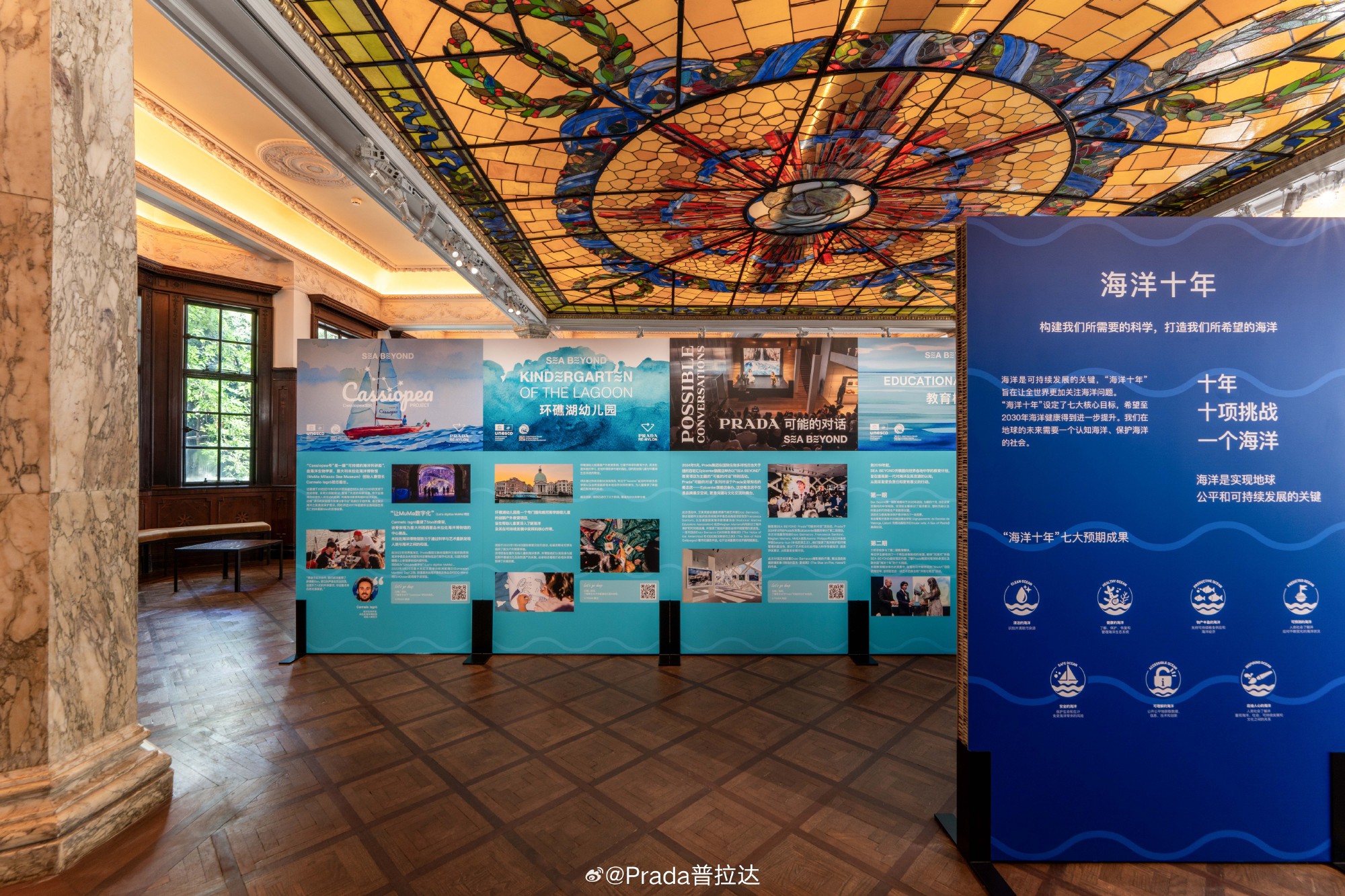 展览以「海洋与气候村」为核心,通过多种方式呈现全球变暖的真实影响,观众可以在「潮起潮落」装置中可看到 1940 至 2100 年的气候轨迹;在「感受变化」中,触摸到酸化后的海洋生态模型。走出宅邸,花园区化为户外影院,播放由 SEA BEYOND 支持的纪录片《环礁湖幼儿园》与《深白森林》,用影像讲述更为广阔的生态叙事。十天的展期里,Prada 还为儿童与成人设计了教育活动与工作坊,将环境意识融入生活体验。