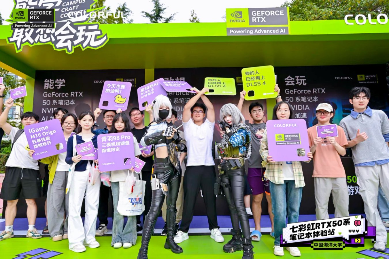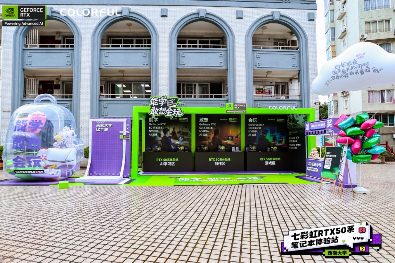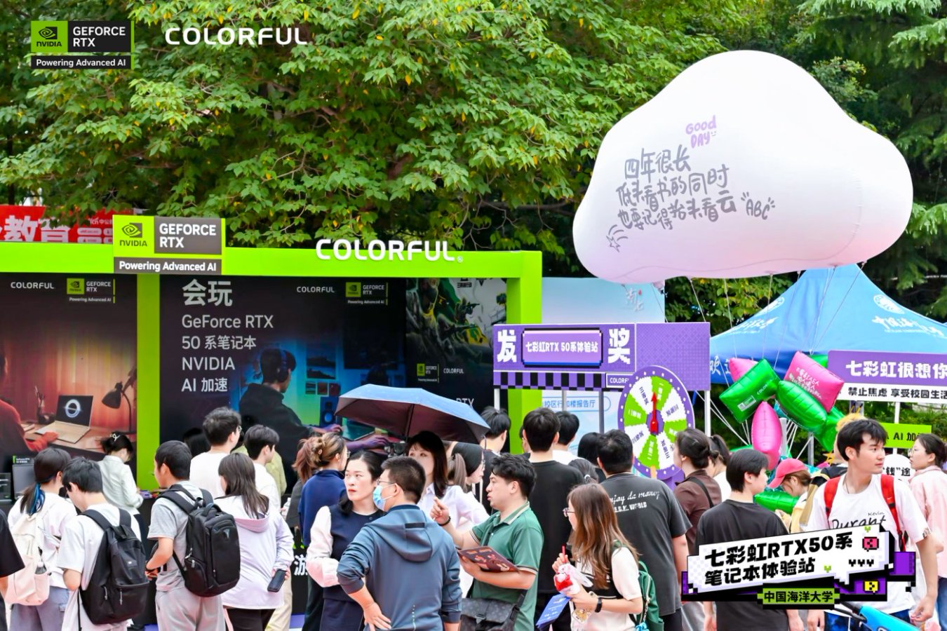 品牌展示区则围绕「能学、敢想、会玩」三大核心理念搭建:能学区提供 AI 等前沿科技的知识分享,满足学生对专业成长的硬核需求;敢想区通过艺术装置与 AI 创意体验,呵护并激发其天马行空的想象力;会玩区则让学生在高性能设备上释放电竞与创作热情,感受性能带来的纯粹乐趣。