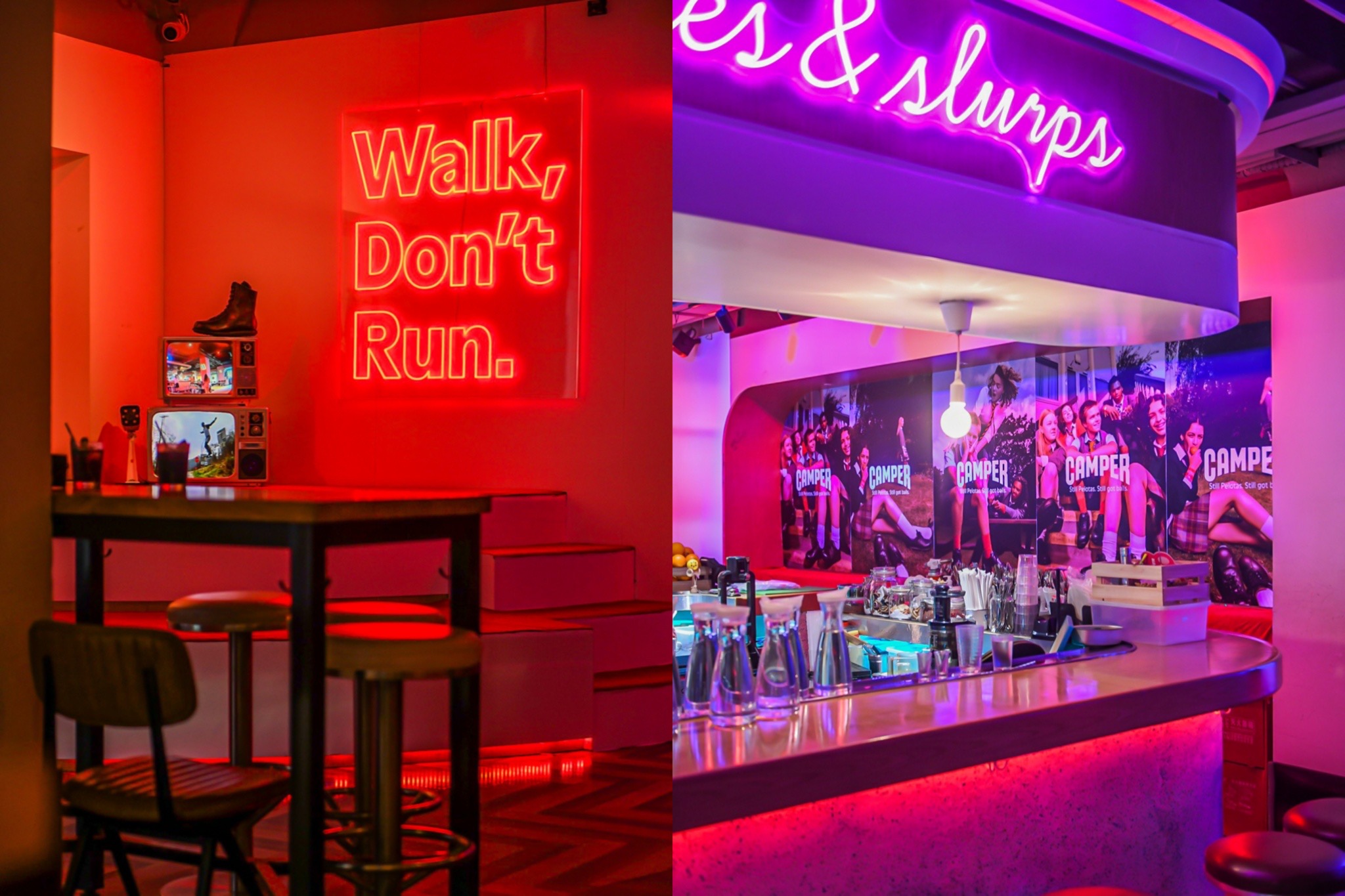 近日,西班牙鞋履品牌 CAMPER 于上海开启复古派对,庆祝经典鞋款 Pelotas Ariel 诞生三十周年。现场以巨型 CAMPER 标志为核心,入口处闪烁的「Walk, Don’t Run.」霓虹标语,瞬间将人带回九十年代。