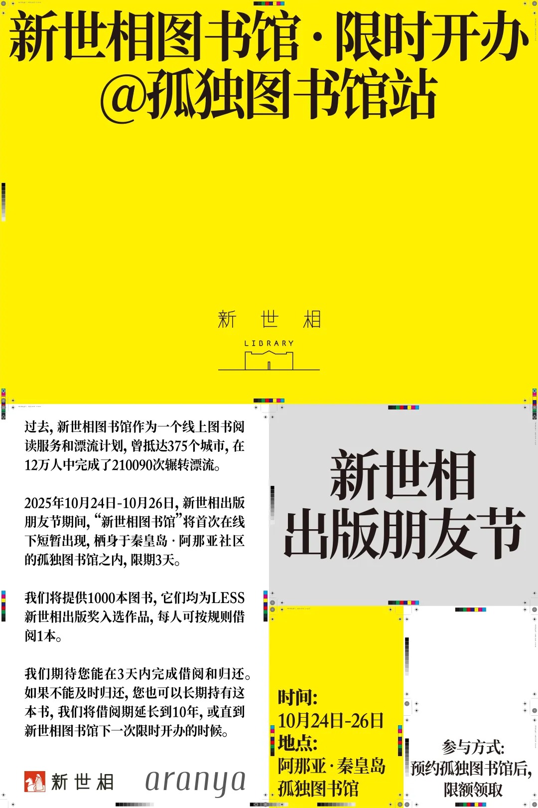 活动期间,双方还会举办 2025「LESS 新世相出版奖颁奖礼」。新世相希望通过持续关注出版生态,来守护我们的精神世界。与此同时,暌违多年的「新世相图书馆」也将回归。从 2016 年到 2017 年,新世相图书馆作为一个线上图书阅读服务和漂流计划,曾抵达 375 个城市、在 12 万人中完成了超 21 万次辗转漂流。这次,品牌以线下限时空间的形式在阿那亚孤独图书馆亮相,1000 本入选书籍在此漂流,等待与读者相遇。