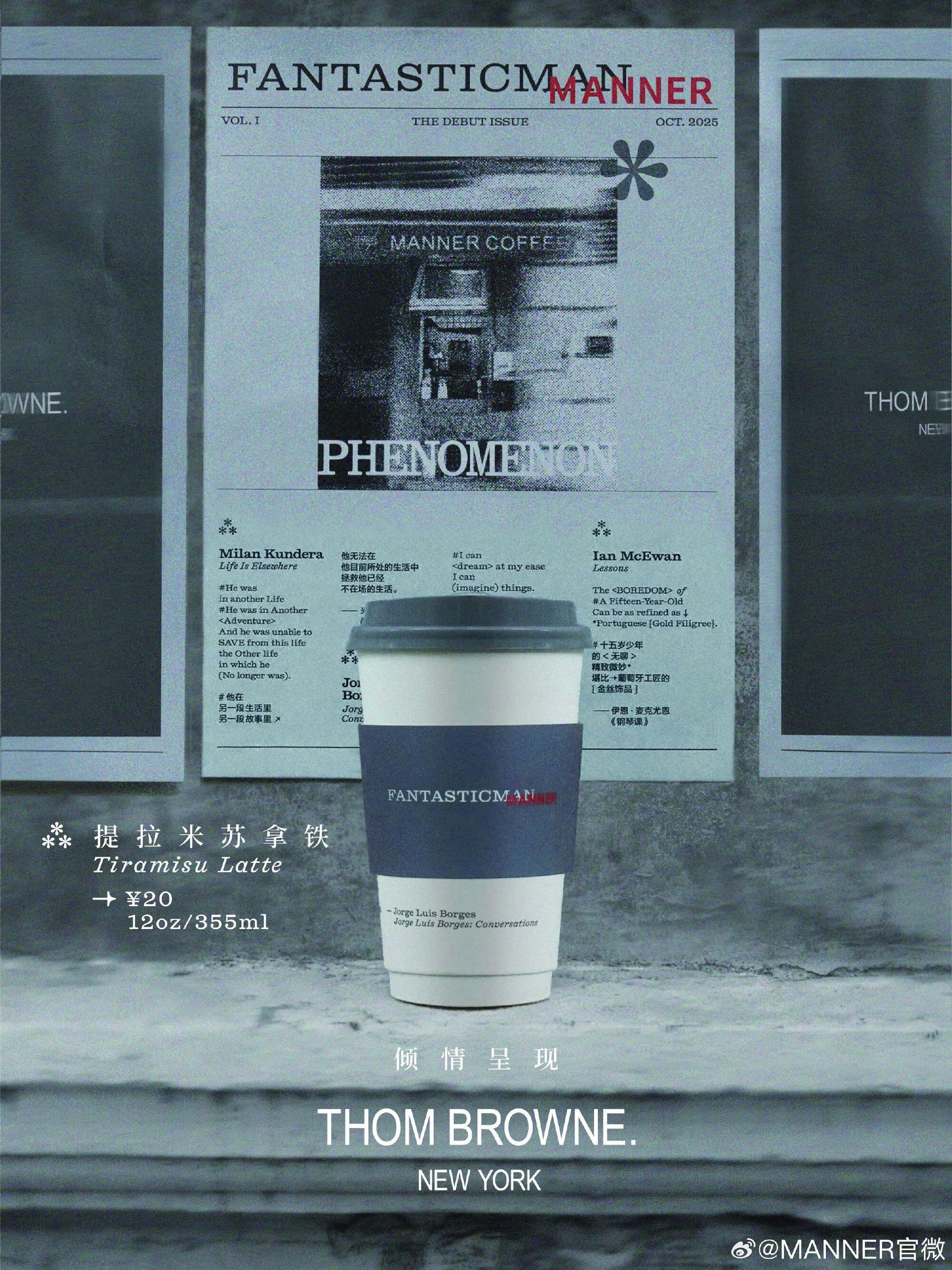活动期间,MANNER 推出联名饮品「提拉米苏拿铁」,并同步上线含联名帆布袋的「Fantastic Man 套餐」。同时,所有饮品均更换为限定联名包装,以黑白颗粒质感呼应印刷风格,并印有麦克尤恩、昆德拉、博尔赫斯等文学金句,让文学语感融入日常饮品体验。