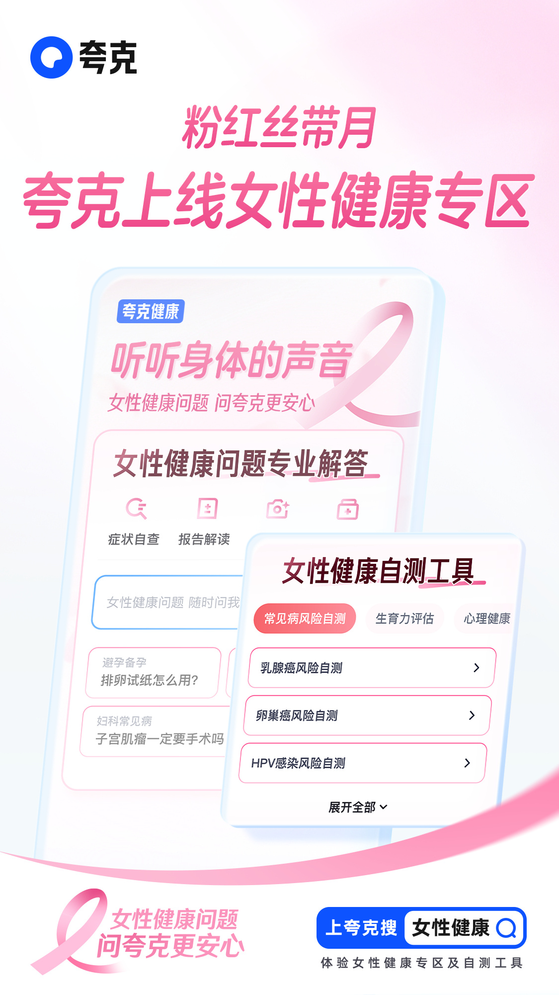 为了让倡导真正落地,夸克还同步上线「女性健康专区」。联合百位妇科主任专业编审女性健康问答,还为女性提供全周期健康自测工具,帮助各位女生用科学的方式了解和回应身体的声音。