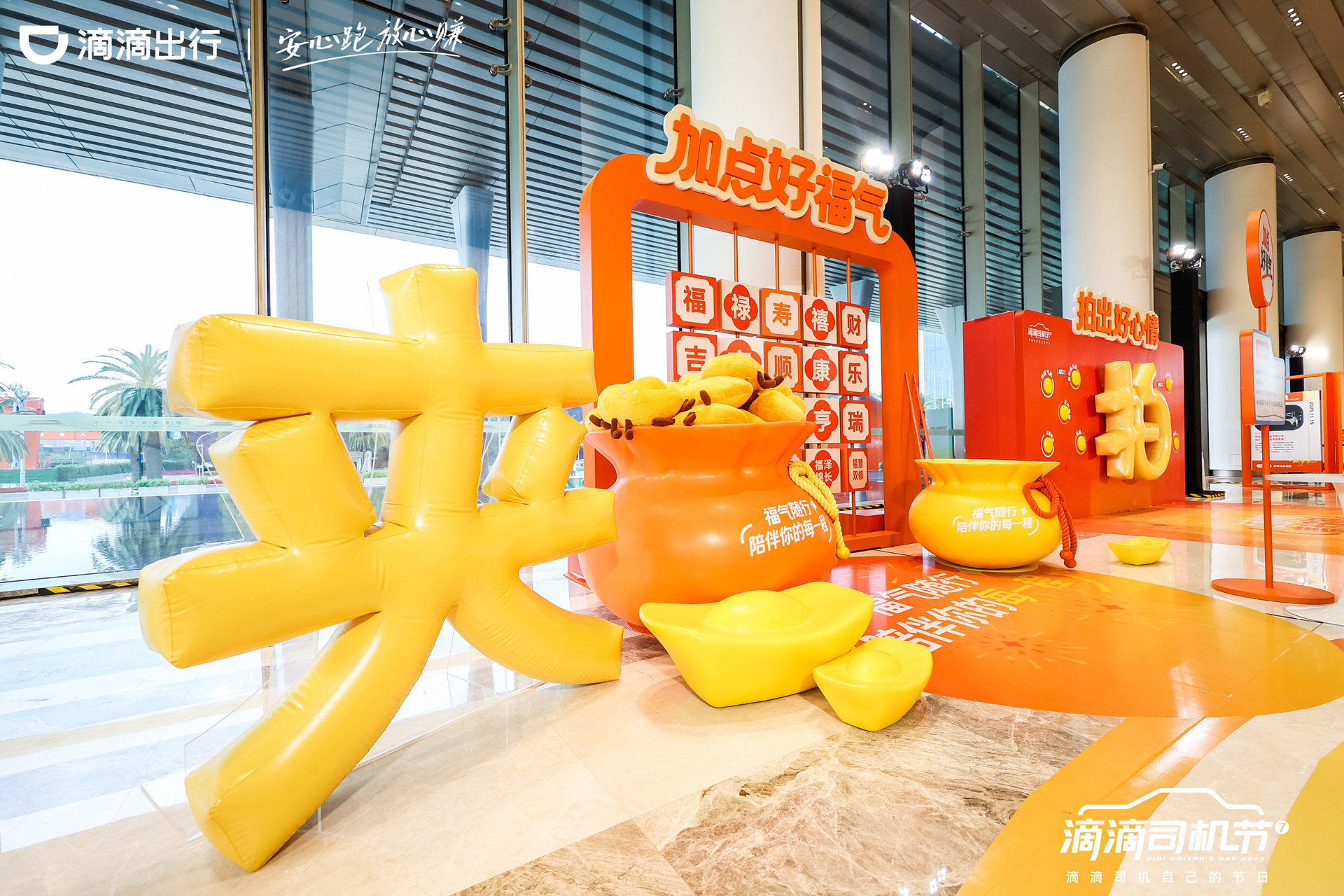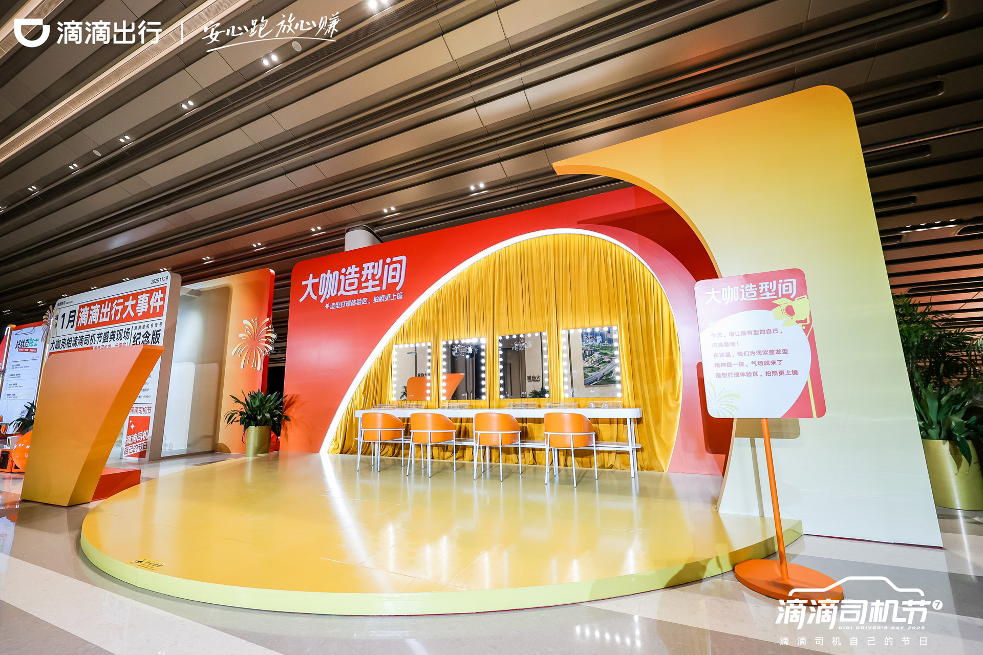 在视觉设计上,全场以滴滴标志性的暖橙色为主基调,从外场大气的「谢谢陪伴每一程」精神堡垒,到内场流动的光影设计,用色彩传递温度,打造沉浸式的节日氛围。
