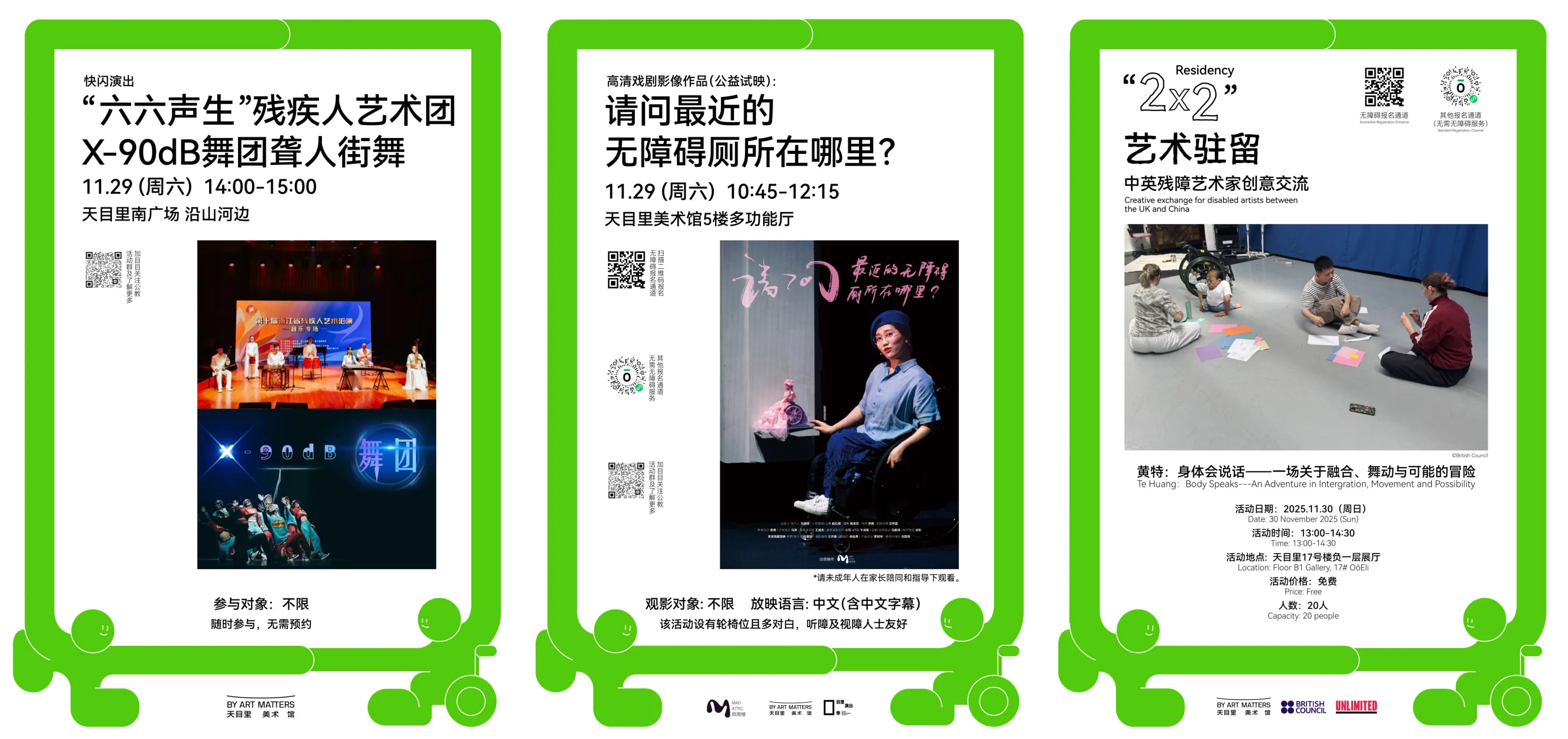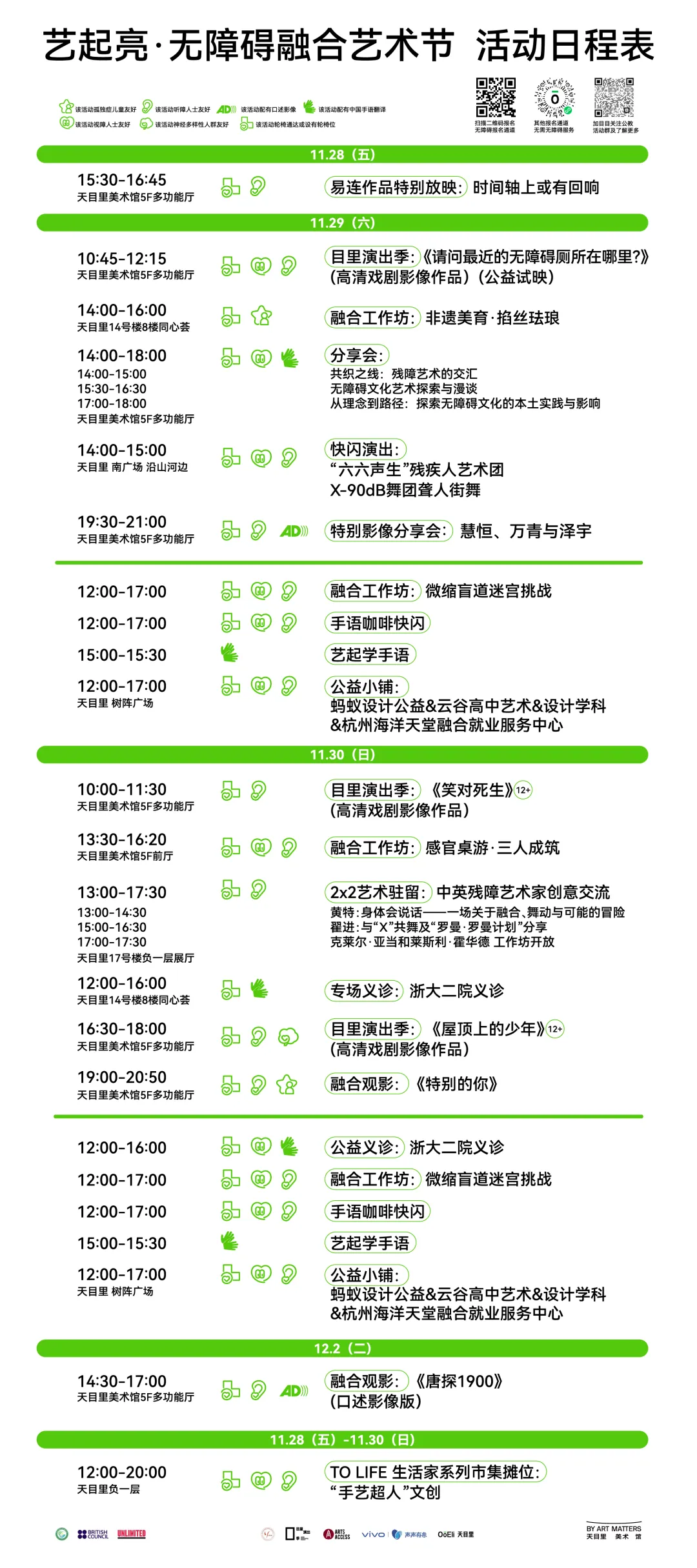 艺术节将从 11 月 28 日持续至 12 月 2 日,活动共分为六大板块:与中英残障艺术家现场进行创意交流的 2x2 艺术驻留;展现多元叙事的特别放映;无障碍艺术家及学者分享会;包括感官桌游、微缩盲道迷宫挑战在内的融合工作坊;由残疾人艺术团及聋人舞团带来的快闪演出;以及「无障碍走进生活」公益快闪。
