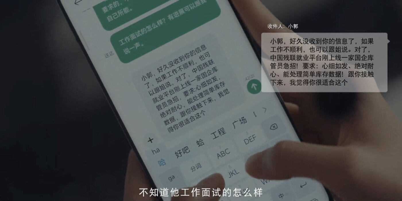 短片中的主角小郭是一名脑瘫患者,也是养老院里细心的护工,他因老人缺药拨通客服电话,获得了雪静专业而周到的指导,从此他便把热线当成了心灵驿站。雪静并未因为他是残疾人就施以同情,而是从平等的视角出发,向他传达理解与支持,一路见证小郭走向新生活。