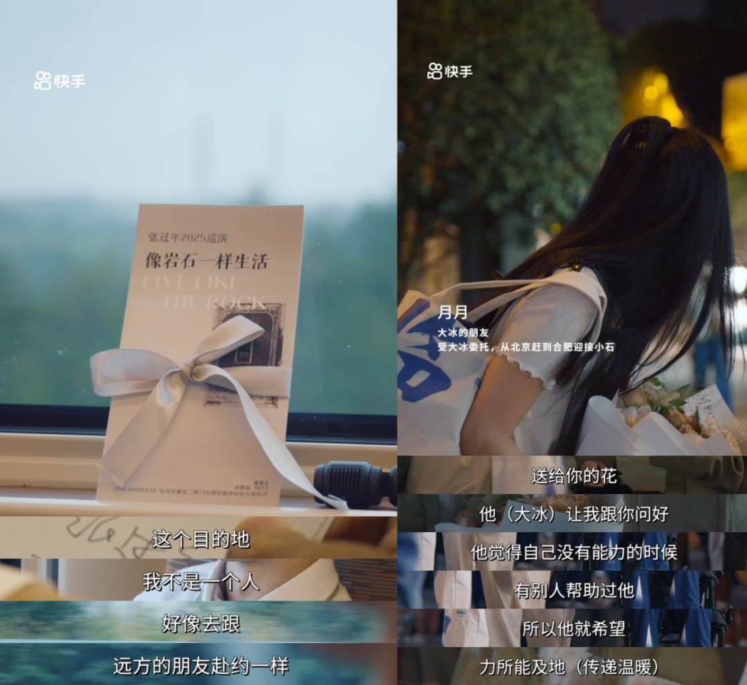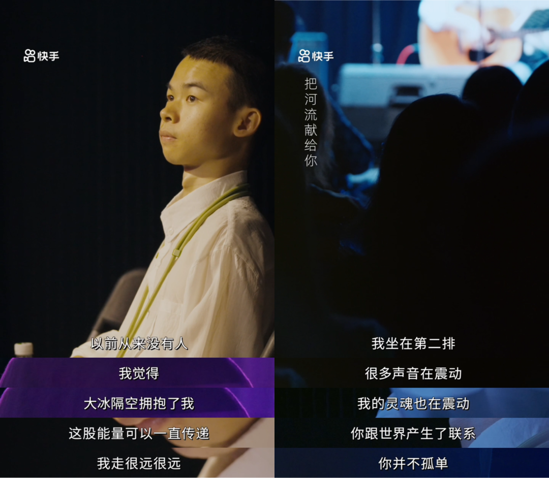 影片完整记录了小石前往合肥看演出的珍贵片段:从家乡辗转轮渡、高铁的舟车劳顿,到收到陌生拥抱时的感动,再到现场聆听音乐时的共鸣,每一个细节都展现着他对生活的热忱。片尾,快手还借助可灵 AI 为小石「补拍」人生中缺席的那些片段:在虚拟世界里,他健步如飞,在阳光下跑过操场,和同学并肩走路,成为了一个普通而自由的年轻人。