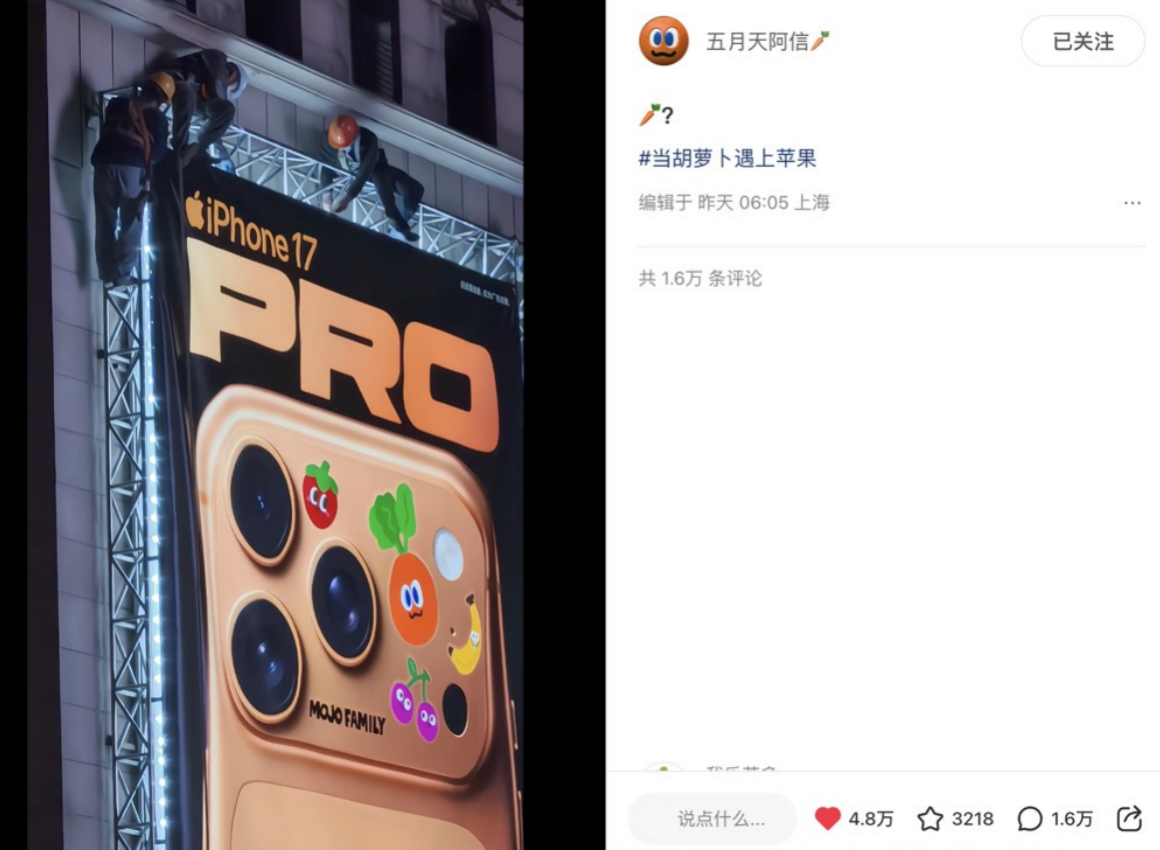 阿信本人也在小红书晒出同款上海新天地广告牌打卡视频,后续,Apple 在社交平台正式官宣,认证此番邀请 MOJO FAMILY 来「装修痛机」确有其事,并以一语双关的萌趣话题标签「当胡萝卜遇上苹果」关联本次合作。