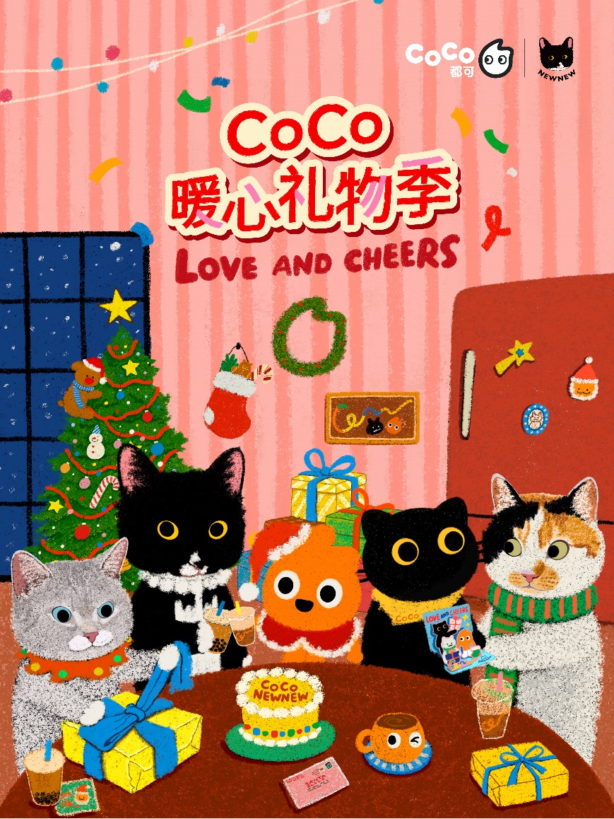12 月 16 日,CoCo 都可宣布与「NEW NEW」(中文名牛牛)联名,拉开圣诞暖心礼物季序幕。牛牛原是流浪于上海街角的一只奶牛猫,遇见艺术家 Lin 后,成为其画笔下穿梭于名画世界的灵动主角。此次联名中,CoCo 品牌 IP「小 Co」与「珠咪」也惊喜入画,与牛牛及其他猫咪伙伴共织温暖画面。