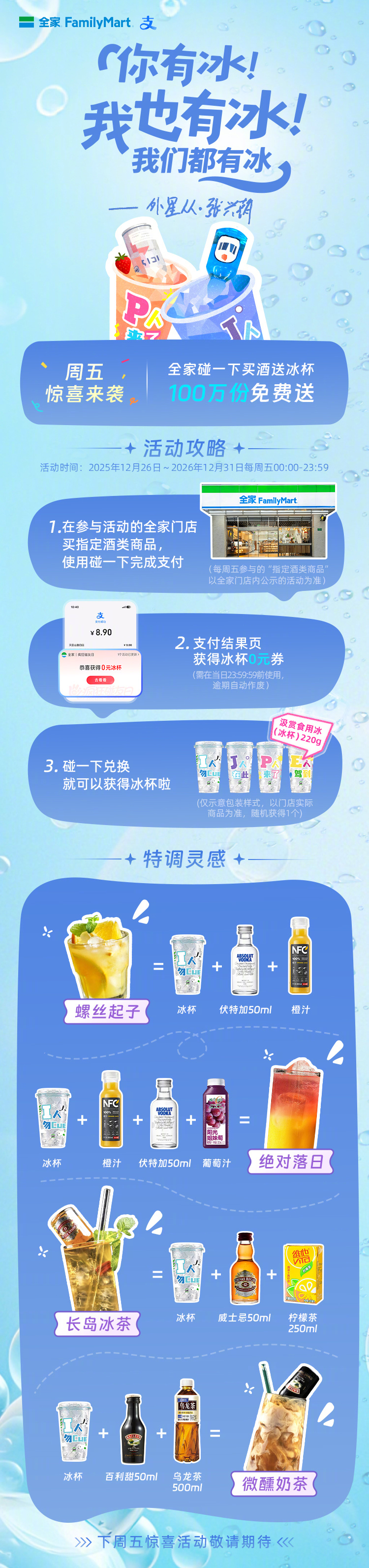 而张兴朝也迅速做出了回应「恰好那天,我有冰,他也有冰,我们都有冰。于是,我们一拍即合,冷不丁梆梆碰一杯。」,不少网友喊话全家要抓住这波热度,于是全家火速赶来,携手支付宝带来「疯狂碰友日」活动,用户只要使用支付宝「碰一下」在全家便利店购买酒饮,可免费获赠冰杯,总计送出 100 万杯。