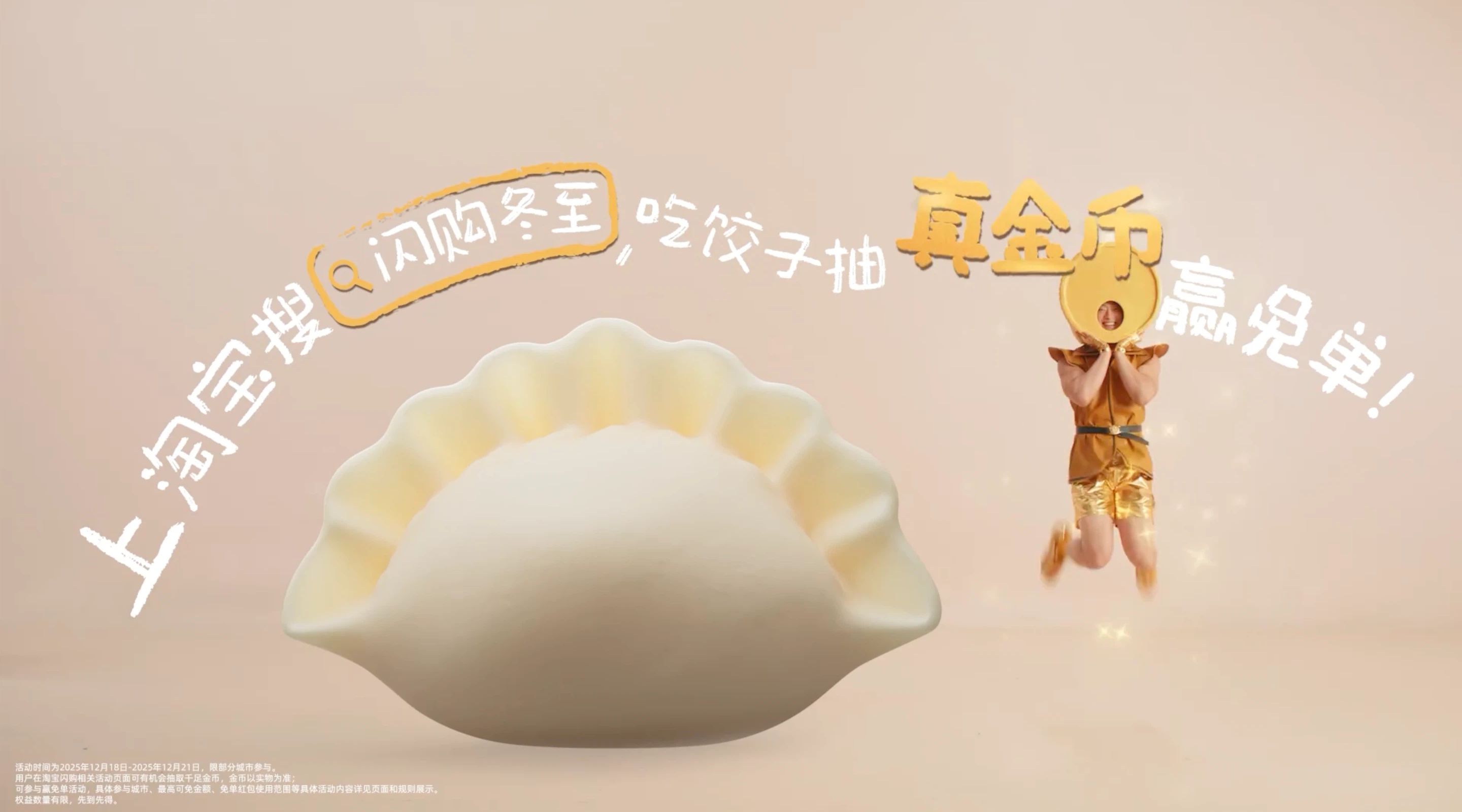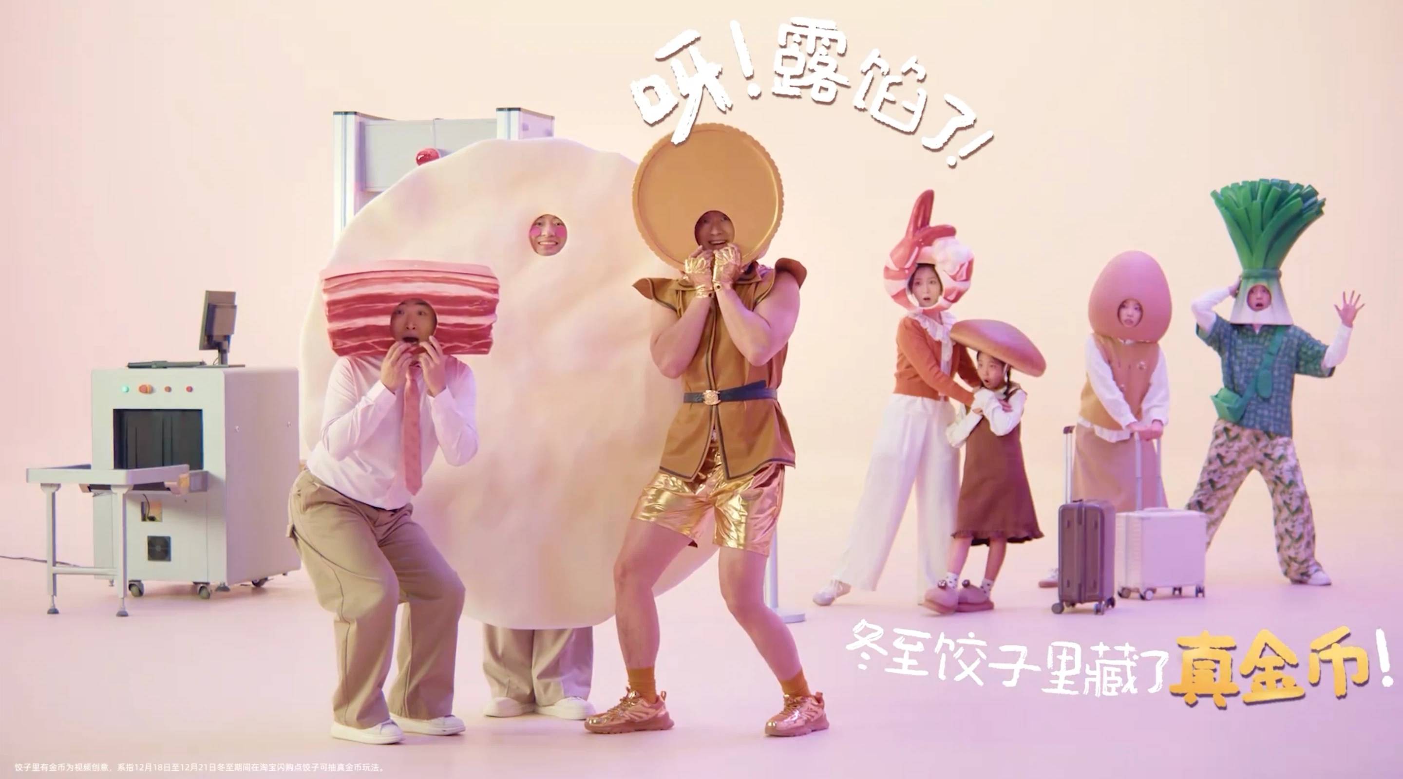 淘宝闪购先以一条脑洞大开的「饺子馅成精」戏精广告拉开序幕。短片通过食材 cosplay 演绎四幕趣味短片,生动还原冬至吃饺子的节日场景:见面篇中,韭菜、鸡蛋、白菜、猪肉、牛肉、金币等食材化身拟人角色,携手奔向饺子皮并相拥成团,演绎双向奔赴的「团圆」氛围;恐怖篇里,食材们围坐看恐怖片,被突然伸出的「筷子手」吓得缩进白毯,秒变圆滚滚的饺子;安检篇中「藏金币的饺子」触发警报、当场「露馅」的桥段,巧妙带出「吃饺子抽真金币」的活动福利,晚安篇中,在大伙熟睡时,韭菜和鸡蛋悄悄把金币包进饺子里,让好运一同进入梦乡。