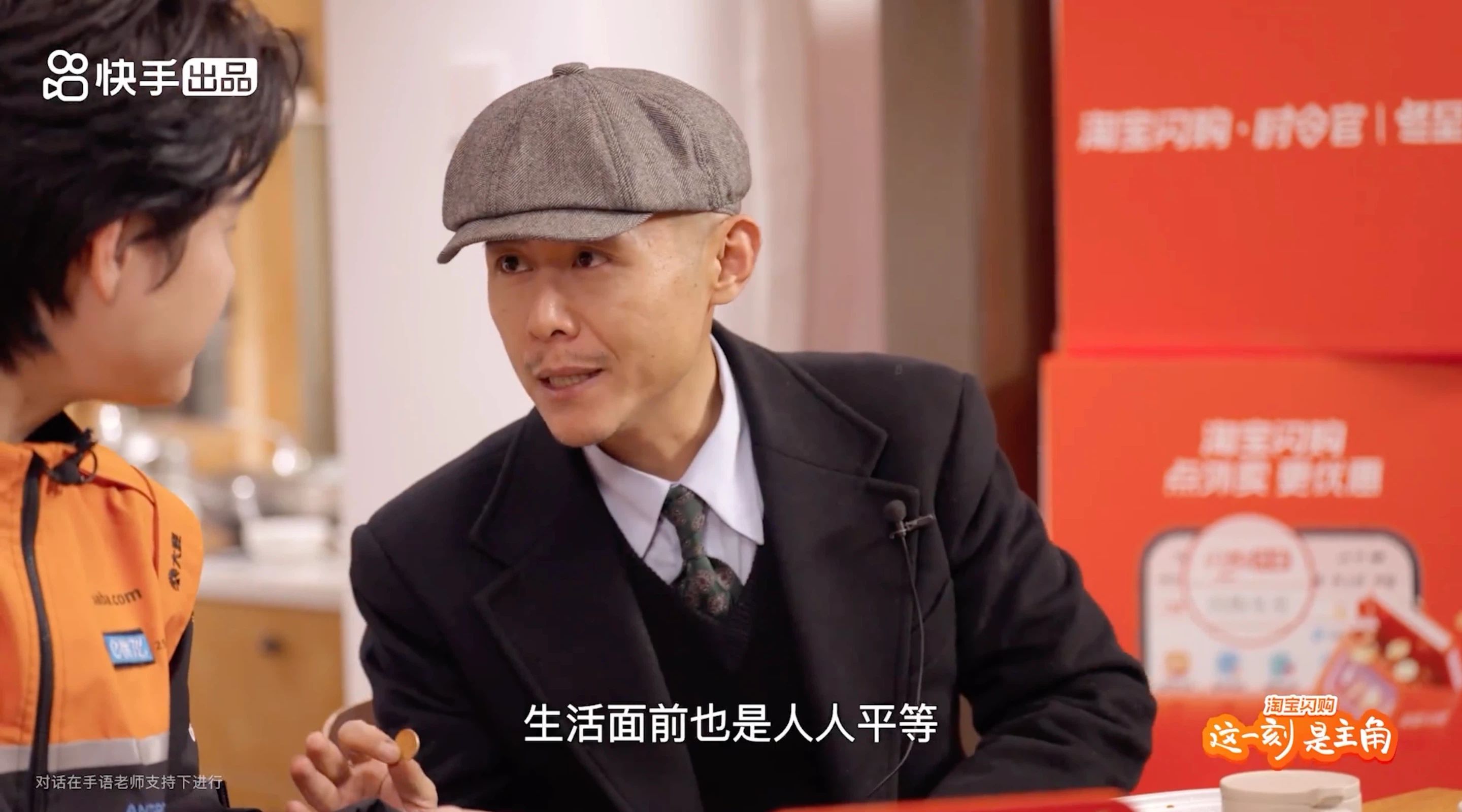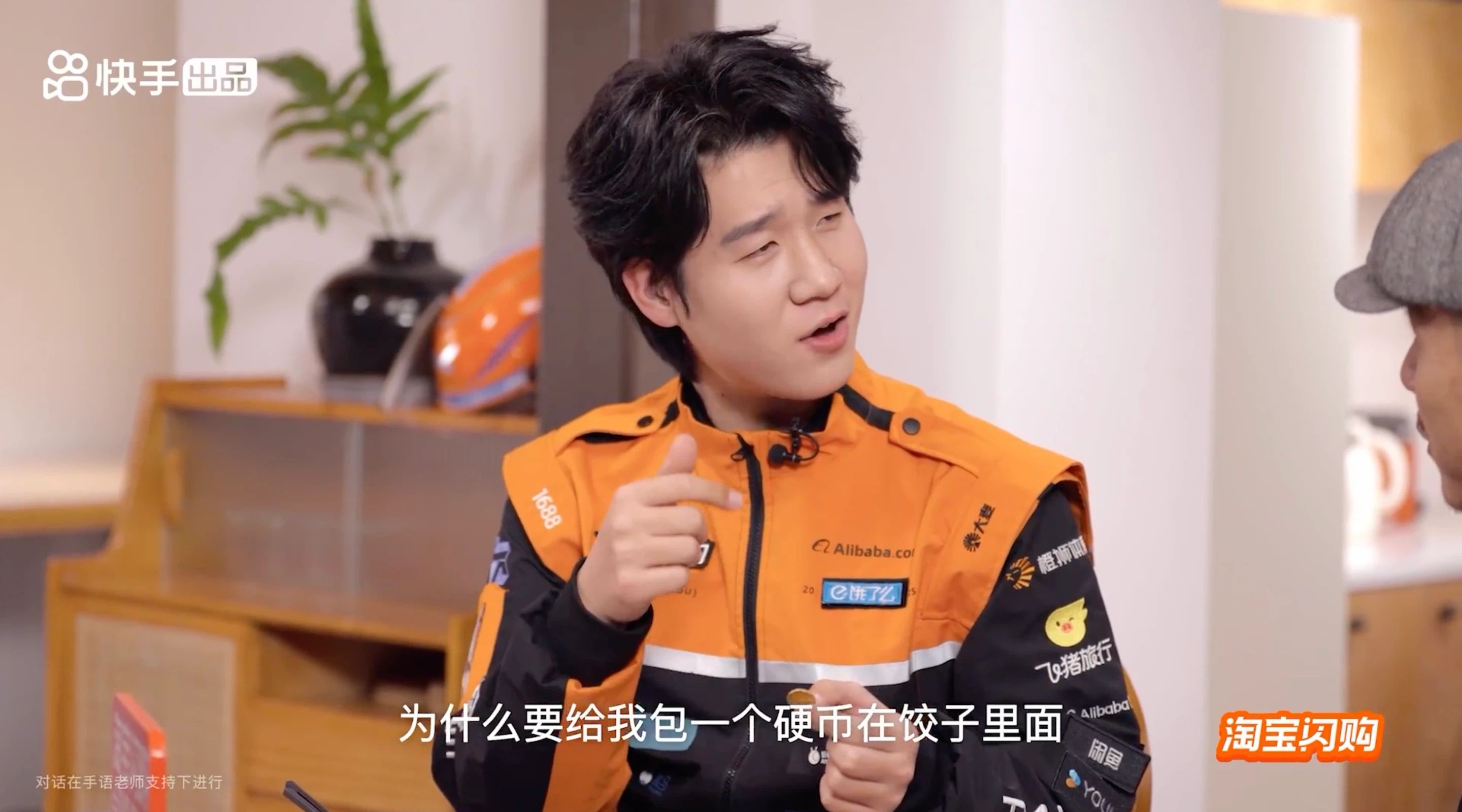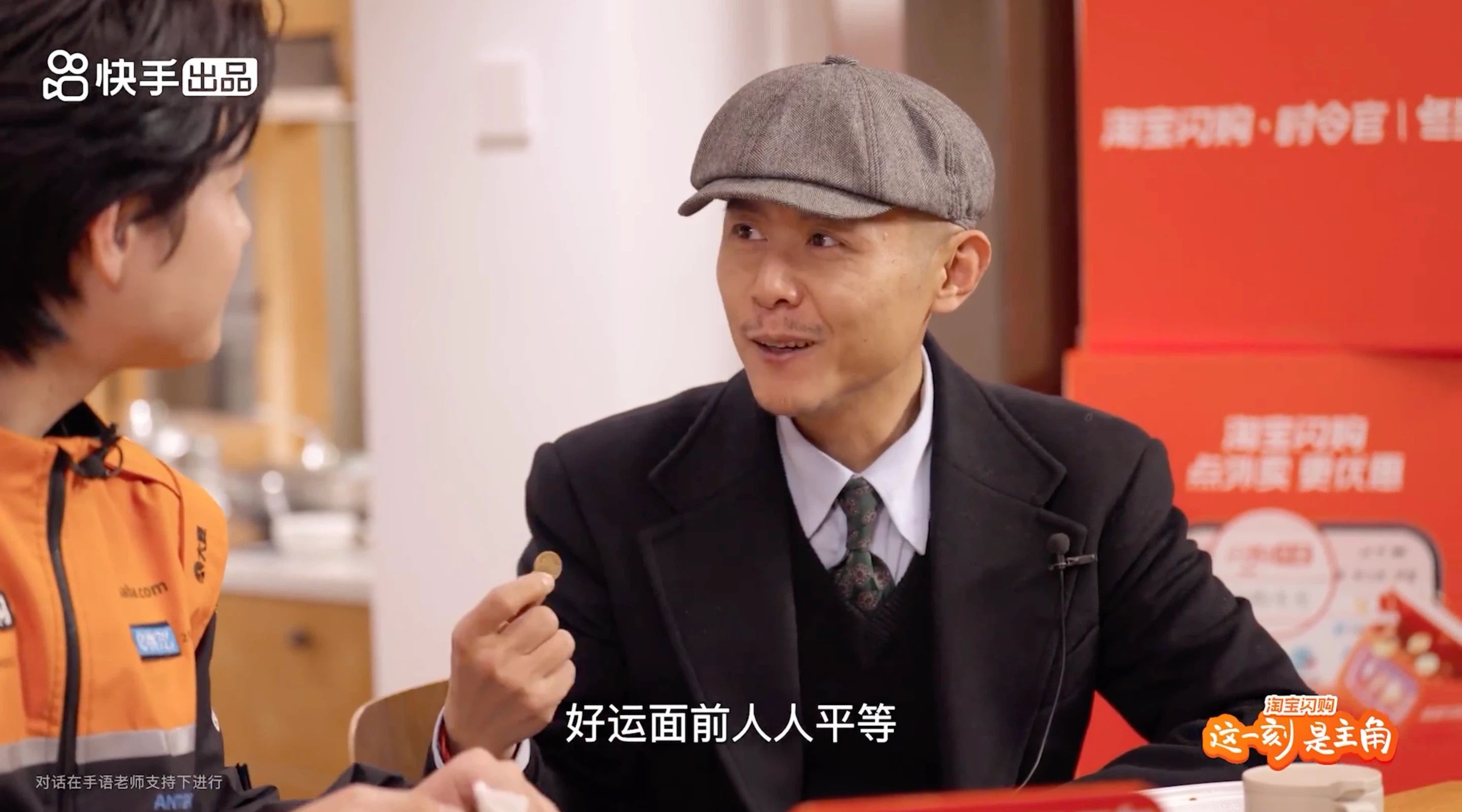 除了轻松搞怪的广告,淘宝闪购还推出快手特约篇《这一刻,是主角》,邀请作家大冰对话闪购无声骑士刘一飞。访谈中,二人围绕冬至团圆、日常坚守展开对话。在吃饺子环节,大冰偷偷给刘一飞的饺子包了一颗专属好运硬币,并给他送上三亚旅游好运福利,用真实故事诠释「幸运面前人人平等,就像生活面前人人平等」的好运哲学。