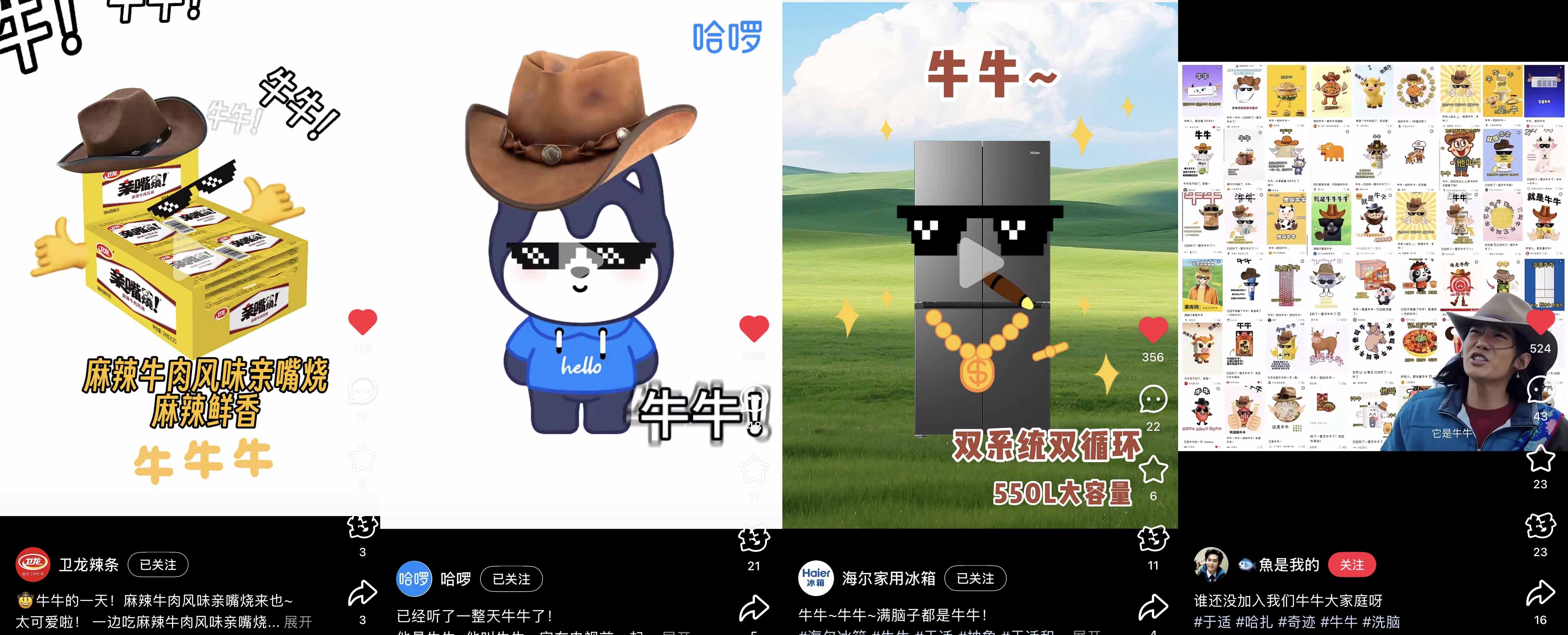 近日,谷粒多代言人于适出演短剧《奇迹》,剧中他饰演的哈扎在寻找牛时不断喊「牛牛」,凭借恰到好处的可爱口音让无数人上头。于是谷粒多迅速抓住这一营销契机,截取于适「牛牛」的音源,巧妙关联品牌核心卖点,传递「奶源牛」「燕麦牛」「扛饿牛」等卖点,实现剧综热度与品牌声量的高效传播。此外,更引发众品牌纷纷跟风一起加入「牛牛」阵营,成为 12 月的「牛」梗。