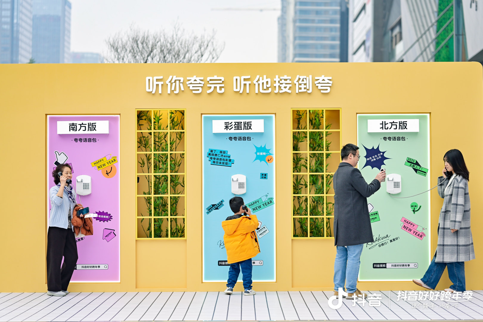线下以「夸夸」为核心,设置了多个互动装置。复古「夸夸电话亭」藏着声音惊喜,拿起听筒,收听到的可能是全国方言夸夸,又或是创作者的真诚祝福。路旁的树木也穿上了温暖的针织毛衣,枝头挂满了抖音创作者的夸夸金句,它们夸的不是遥不可及的成就,而是每个人都有的生活闪光点,漫步其中,不经意间就会与这些真诚的夸赞相遇。