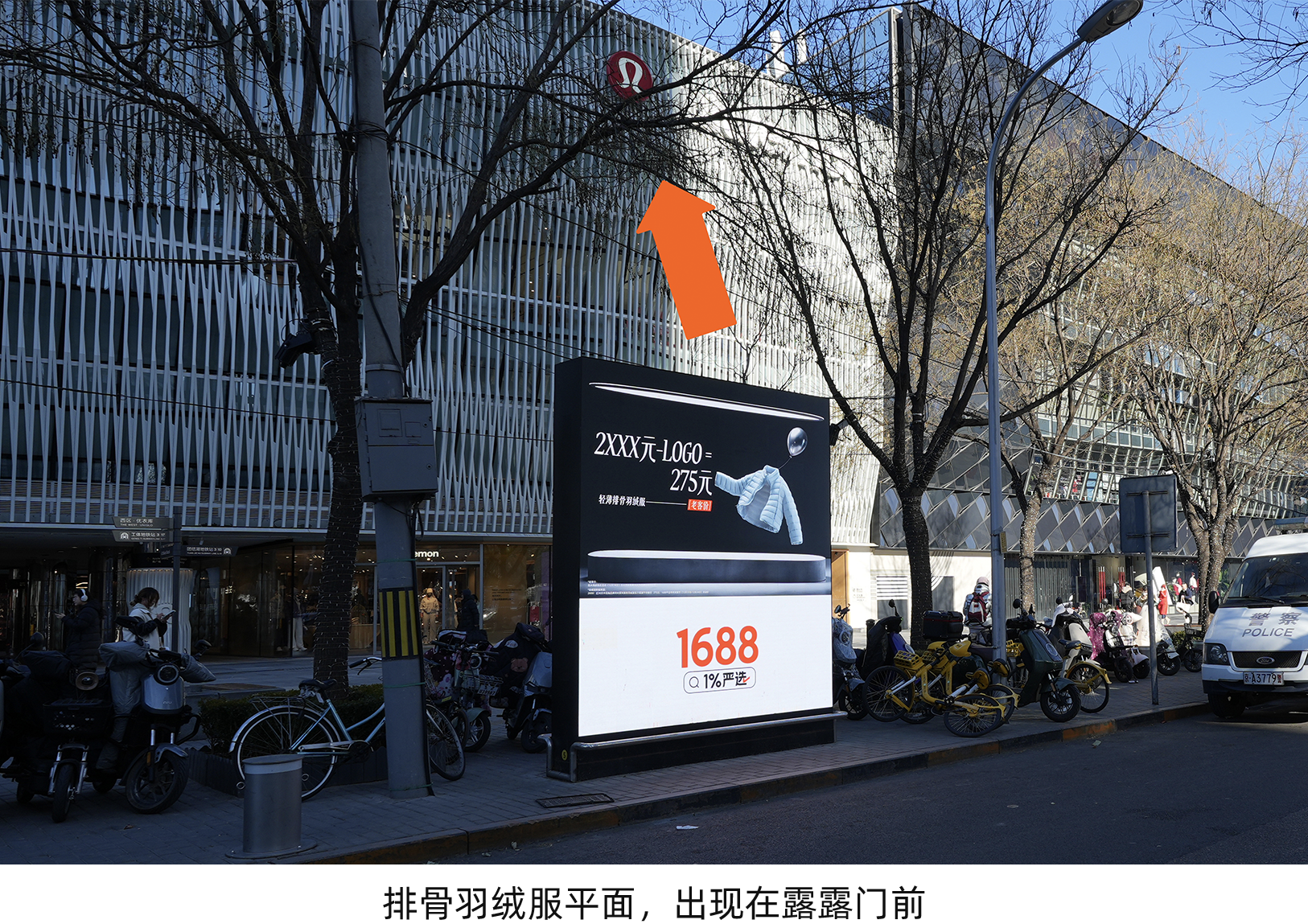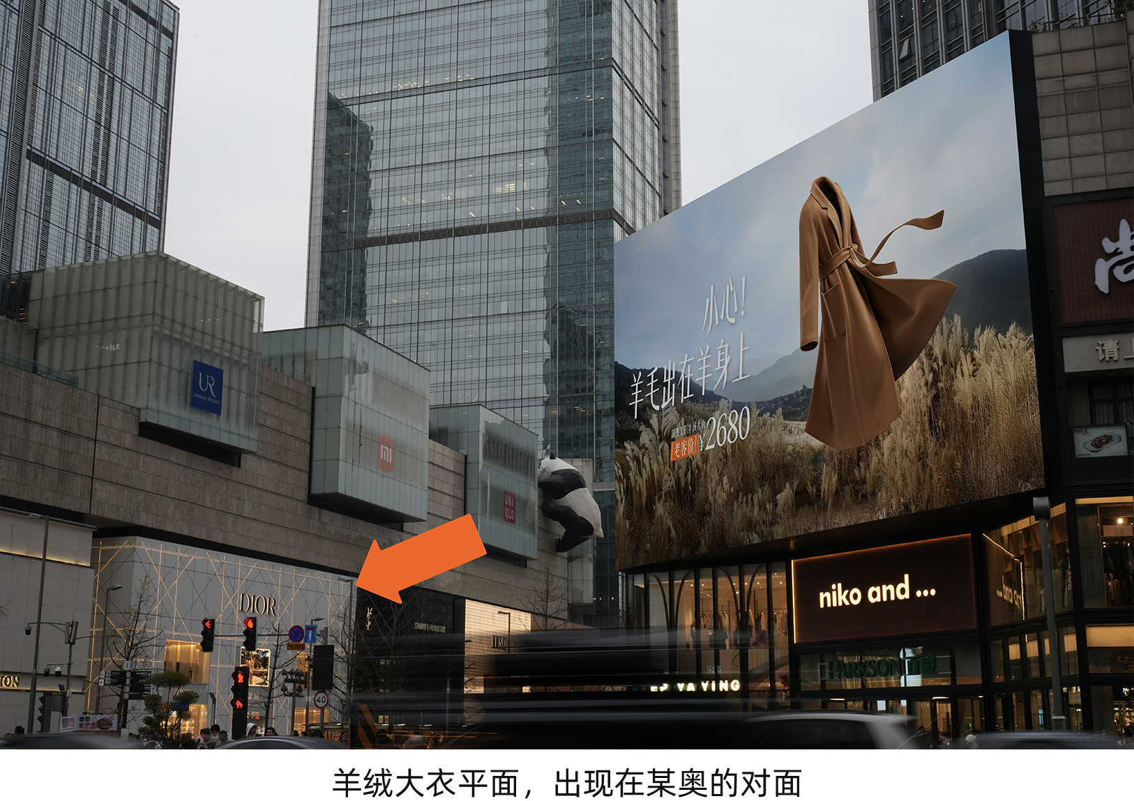 为快速建立 B 端采购信任,1688 将广告直接置于奢侈品主场旁——在成都春熙路 DIOR 与爱马仕对面,竖起「专柜品质,克拉自由,价格 1499/克拉」的培育钻广告;在上海金鹰 Loro Piana 与 Burberry 对面,以「小心!羊毛出在羊身上」的双关语呈现羊绒大衣,用「贴脸开大」的方式自信传递品质与价格的反差。