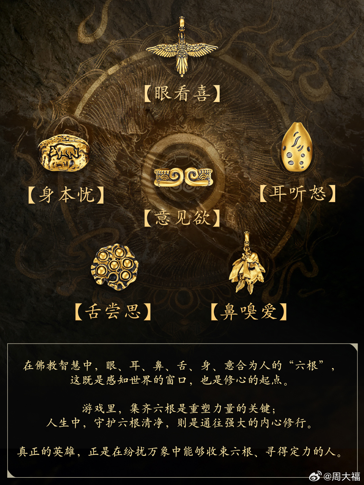 「眼、耳、鼻、舌、身、意」被称为人的「六根」,作为肉身与世界的六条通途,让人们在呼吸间,吐纳世间悲欢。而在《黑神话:悟空》的世界里,孙悟空的生命印记化作六枚蕴藏心绪的「根器」:身本忧、耳听怒、眼看喜、舌尝思、鼻嗅爱、意见欲。它们既是散落的残念,亦是重聚的线索,在这场宿命中,见证一场英雄的自我觉醒与重塑。周大福以匠心设计捕捉六根精髓,让内在修行通过珠宝的美学具象化。