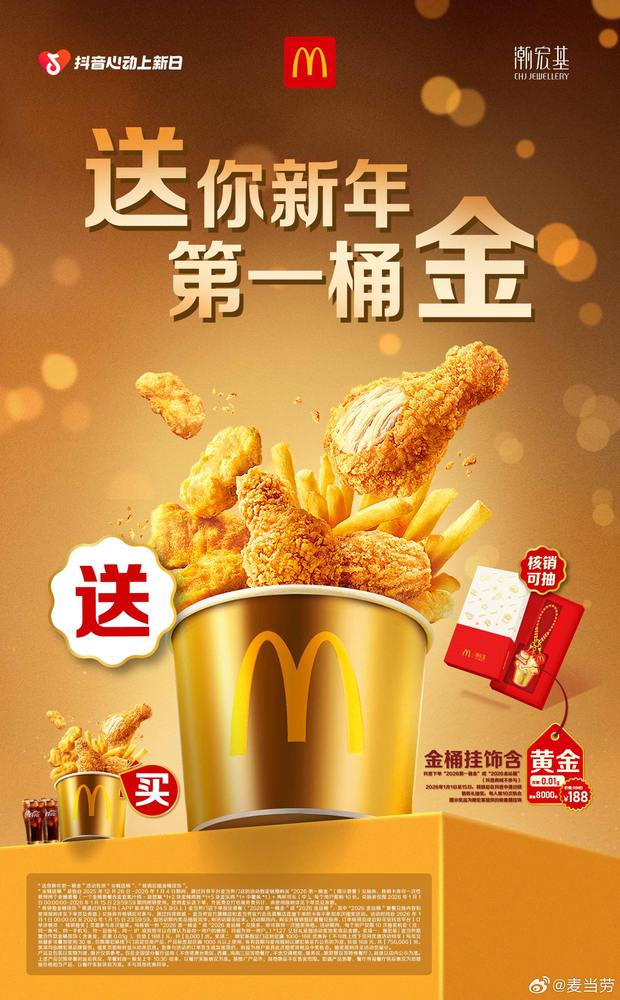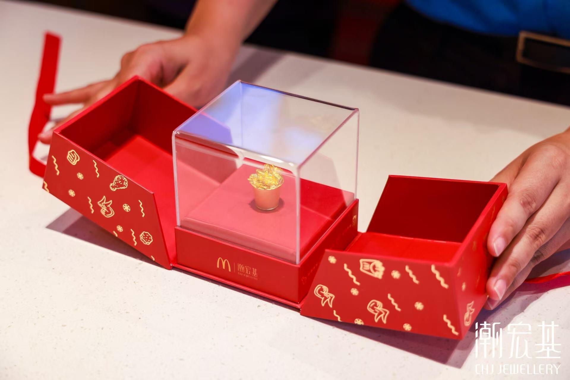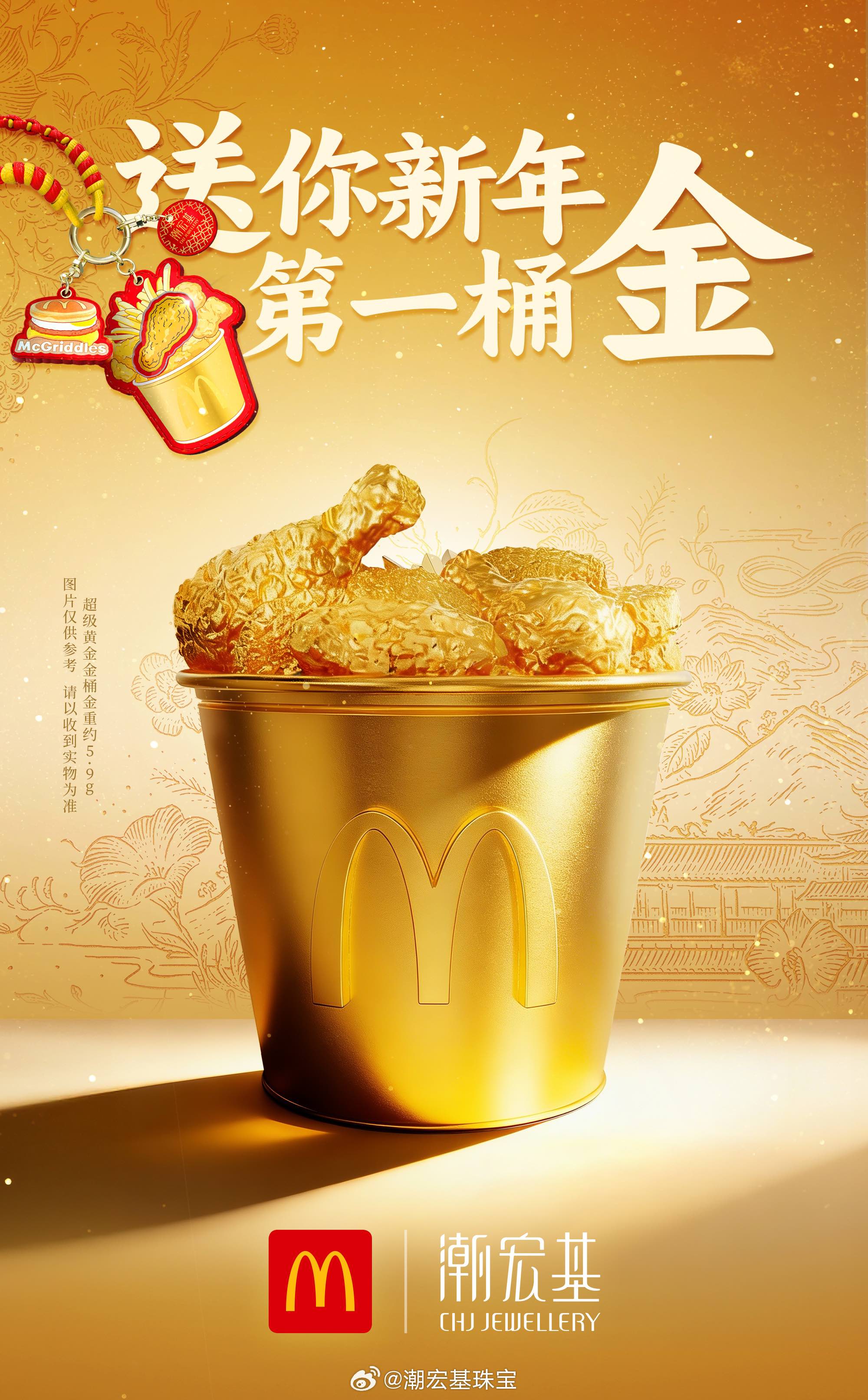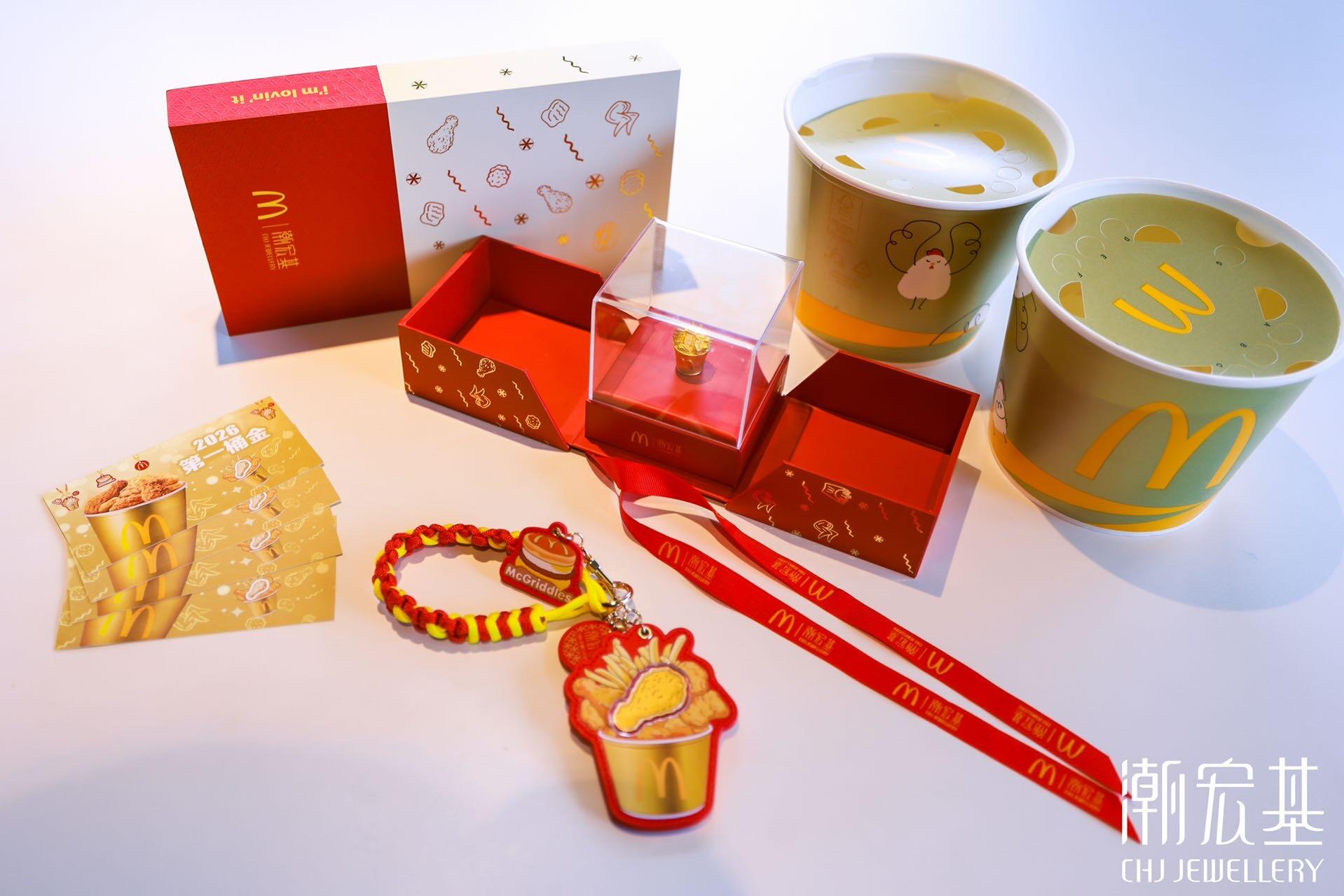 活动期间,用户在麦当劳抖音直播间购买麦金桶套餐,套餐核销后就有机会抽取真金周边。更有意思的是,潮宏基和麦当劳还在深圳田面打造了一家线下主题痛店,焕然一新的麦麦小镇排起长长长长队,精准接住大家新年求好运、求暴富的心理。这不仅是一次有料有趣的品牌联名,更是把周边做成社交货币,给足大家「金来运转」的情绪价值和新年仪式感。