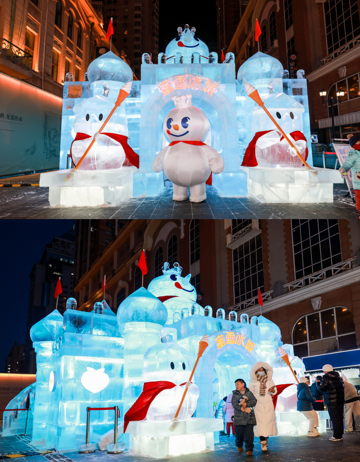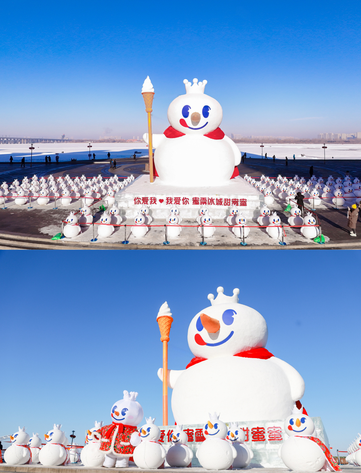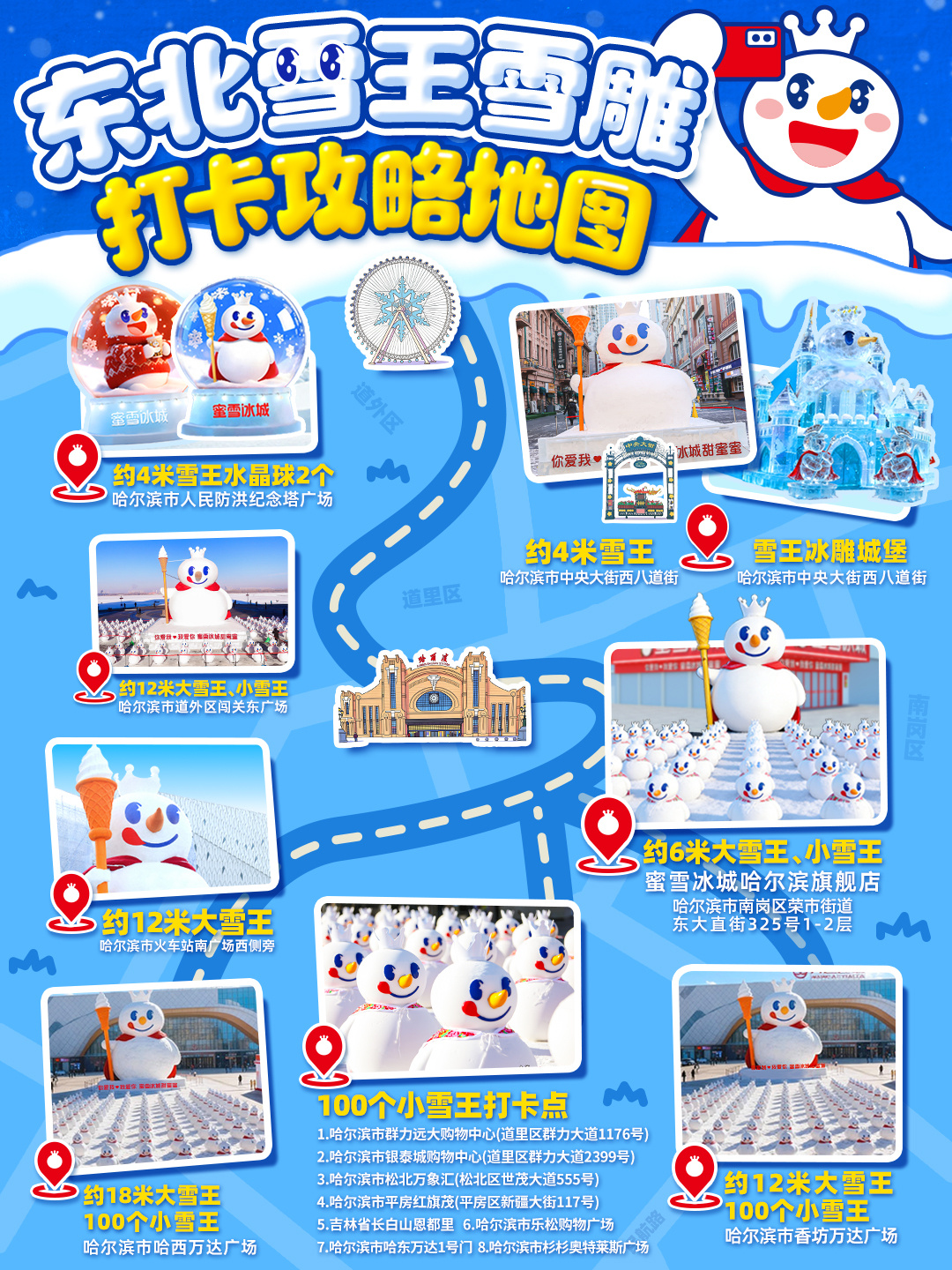 除了延续去年的雪雕方阵,蜜雪冰城还新增了带滑梯的雪王冰雕城堡、4 米高水晶球以及 18 米高的「雪王」巨型雪雕,并贴心推出打卡攻略,邀请游客感受雪王的甜蜜暴击。