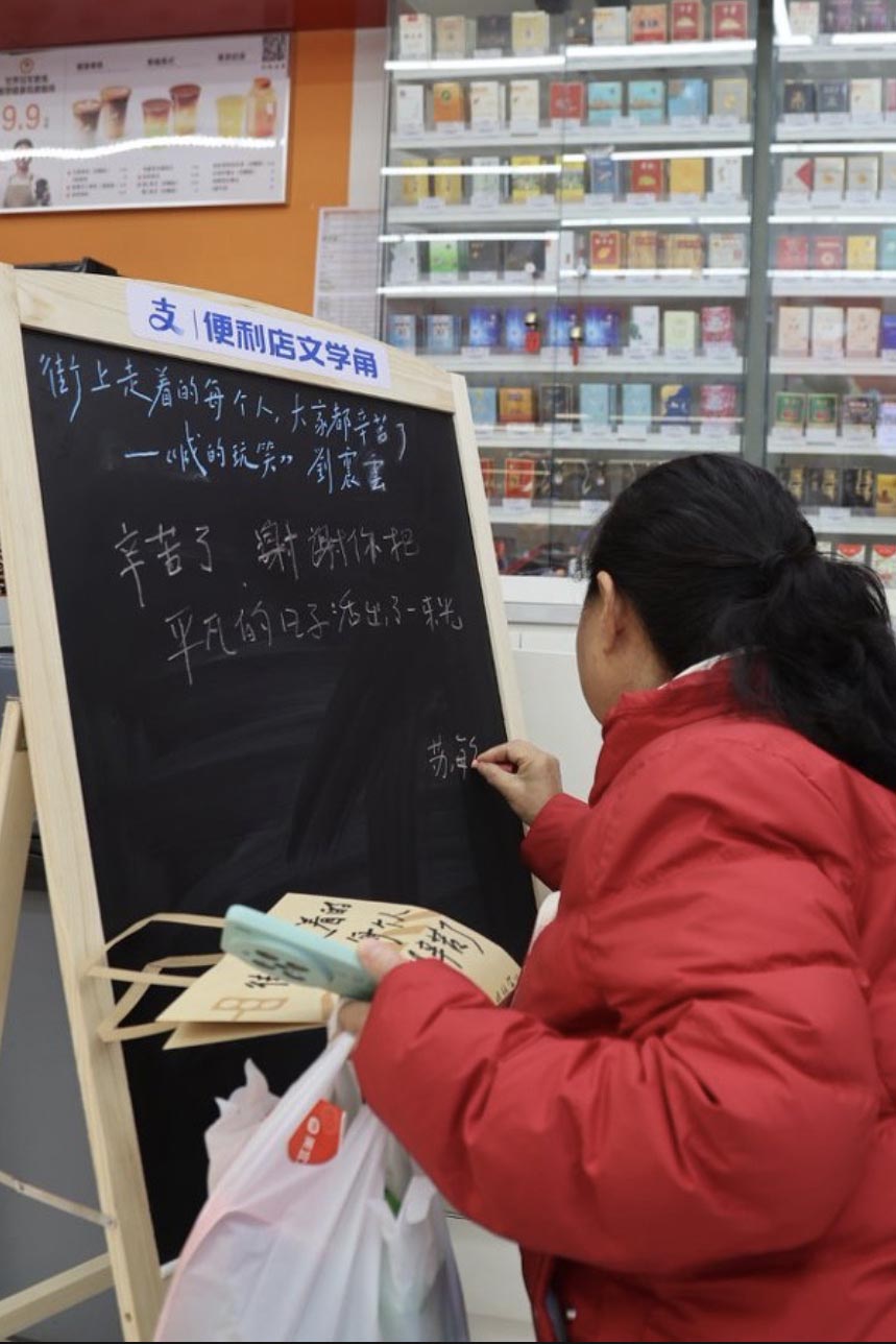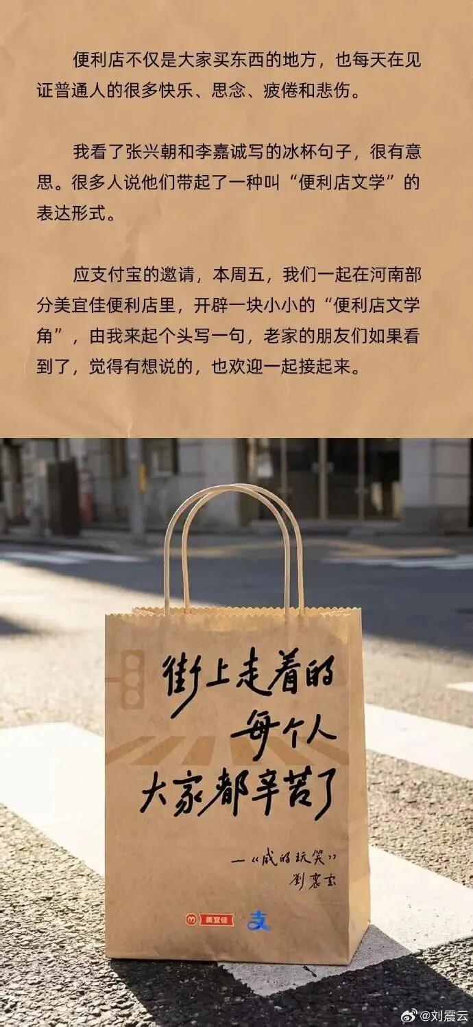 也正是在与网友的互动许愿中,支付宝一步步发掘出了「便利店文学」的独特魅力——它从杯套上的文案,延展到购物袋上的金句,最终生长为便利店一角的公共书写。这种由明星提供灵感引信、普通人接力书写生活本味的共创过程,让文学回归到日常场景里,引发了广泛的情感共鸣。