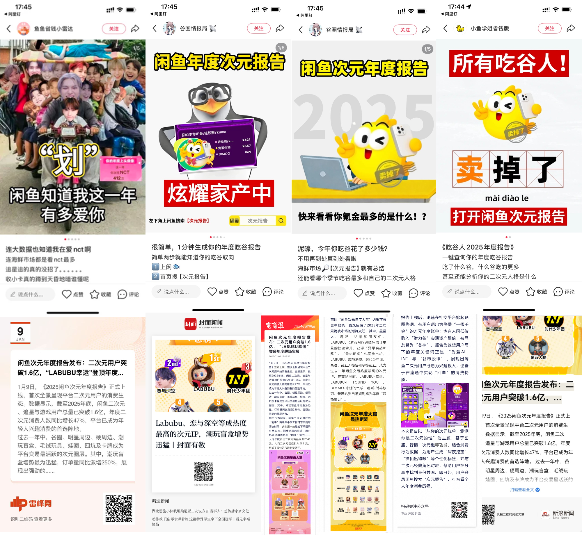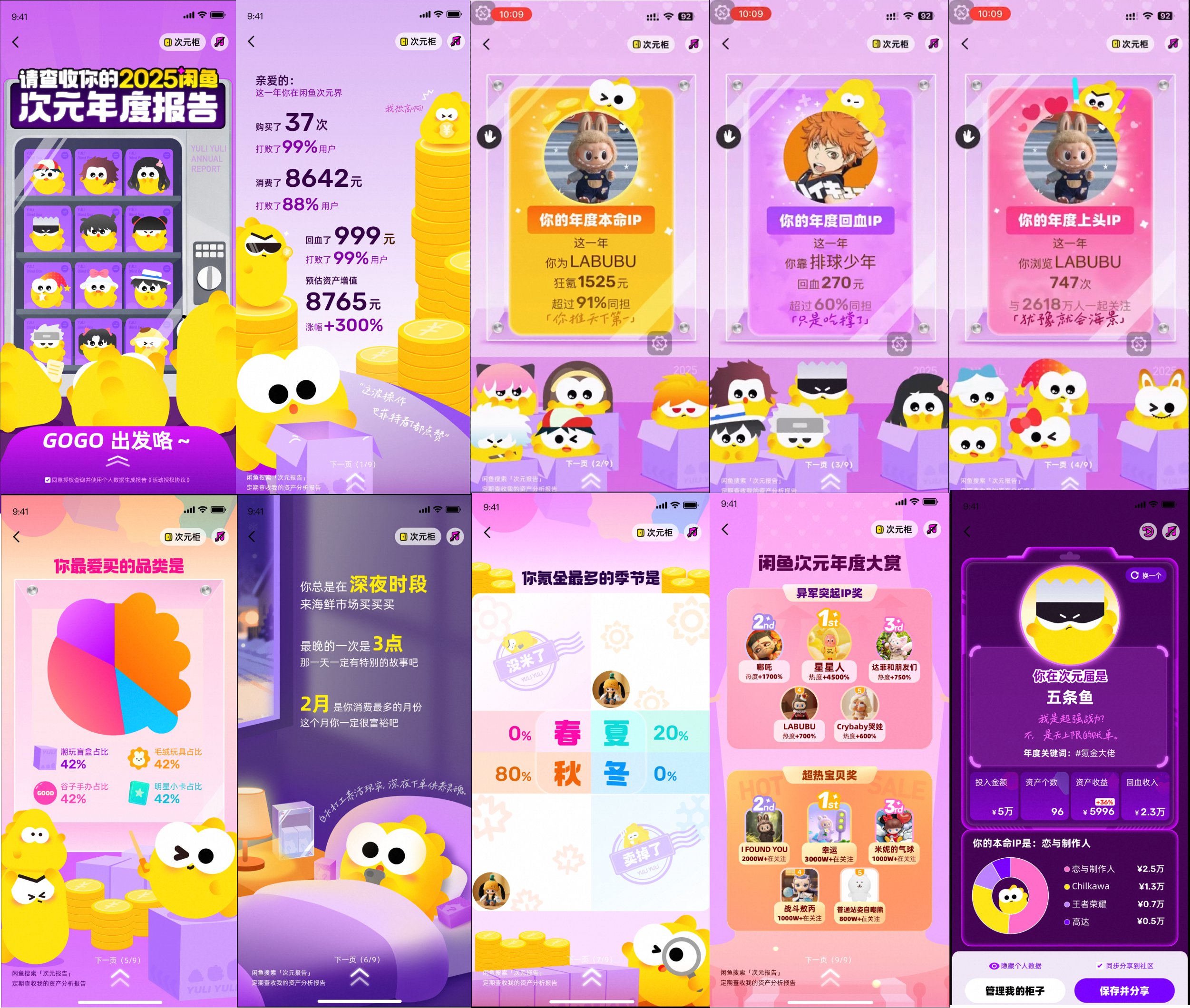 本次报告以「从你的次元账单,测测你是二次元的谁」为主题,基于图鉴、行情、次元柜等功能,结合消费行为数据,为用户生成「深夜挖宝」「神仙出物咪」「氪金大佬」「谷市股神」「精神股东」等个性化标签,并与二次元经典角色对应,帮助用户在分享中找到身份共鸣,引发社交平台晒图热潮。[SocialBeta]