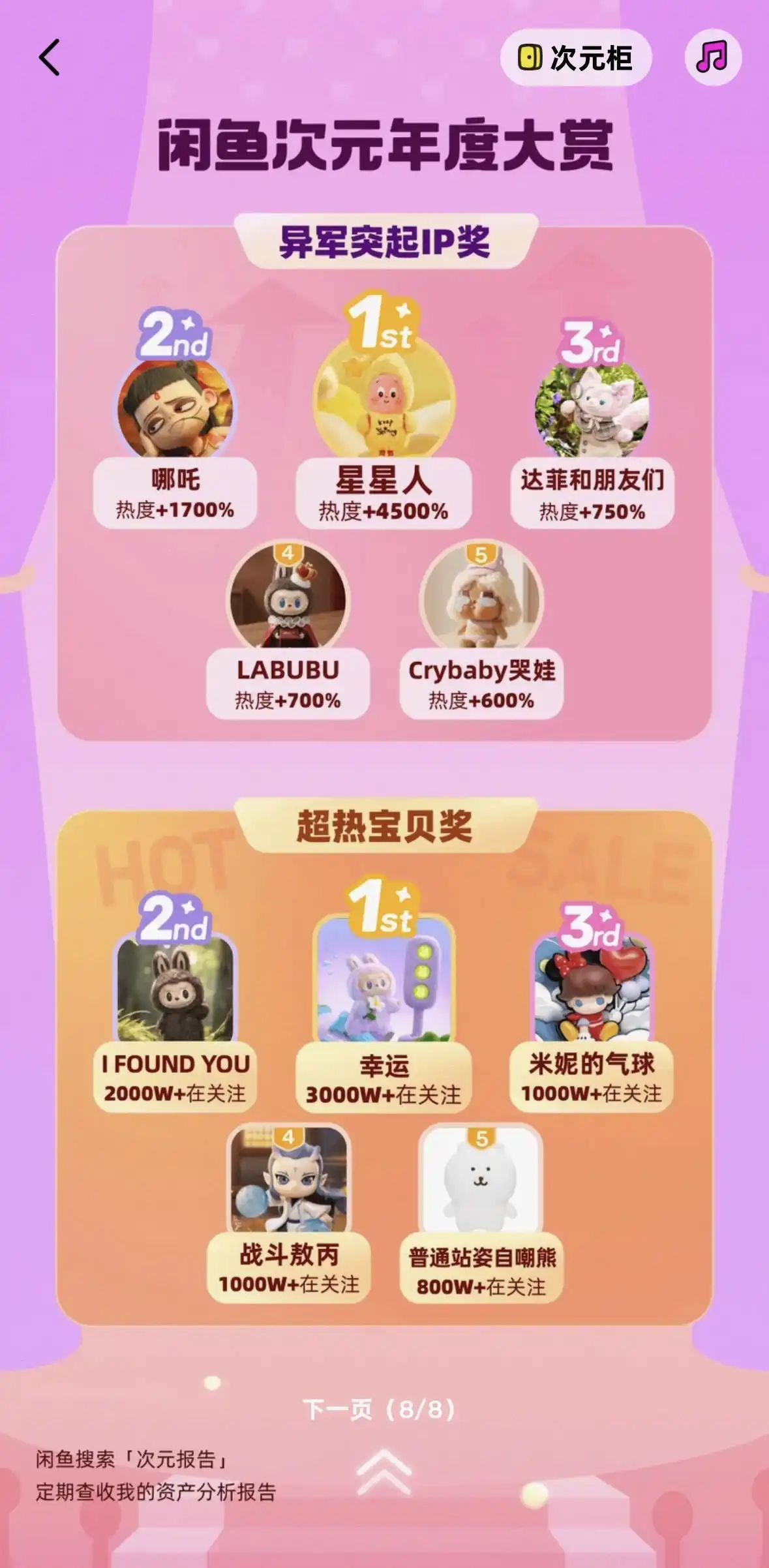 在 IP 热度方面,「最热 IP 奖」前五名为:Labubu、恋与深空、时代少年团、高达、第五人格;「异军突起 IP 奖」则由星星人、哪吒、达菲和朋友们、Labubu、Crybaby哭娃获得。年度热门商品包括 Labubu-幸运、哪吒-战斗敖丙等。