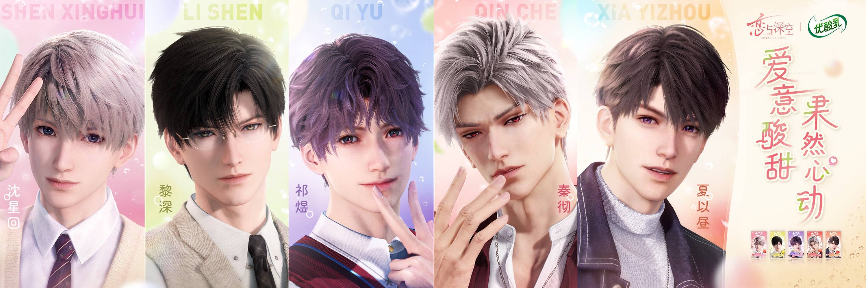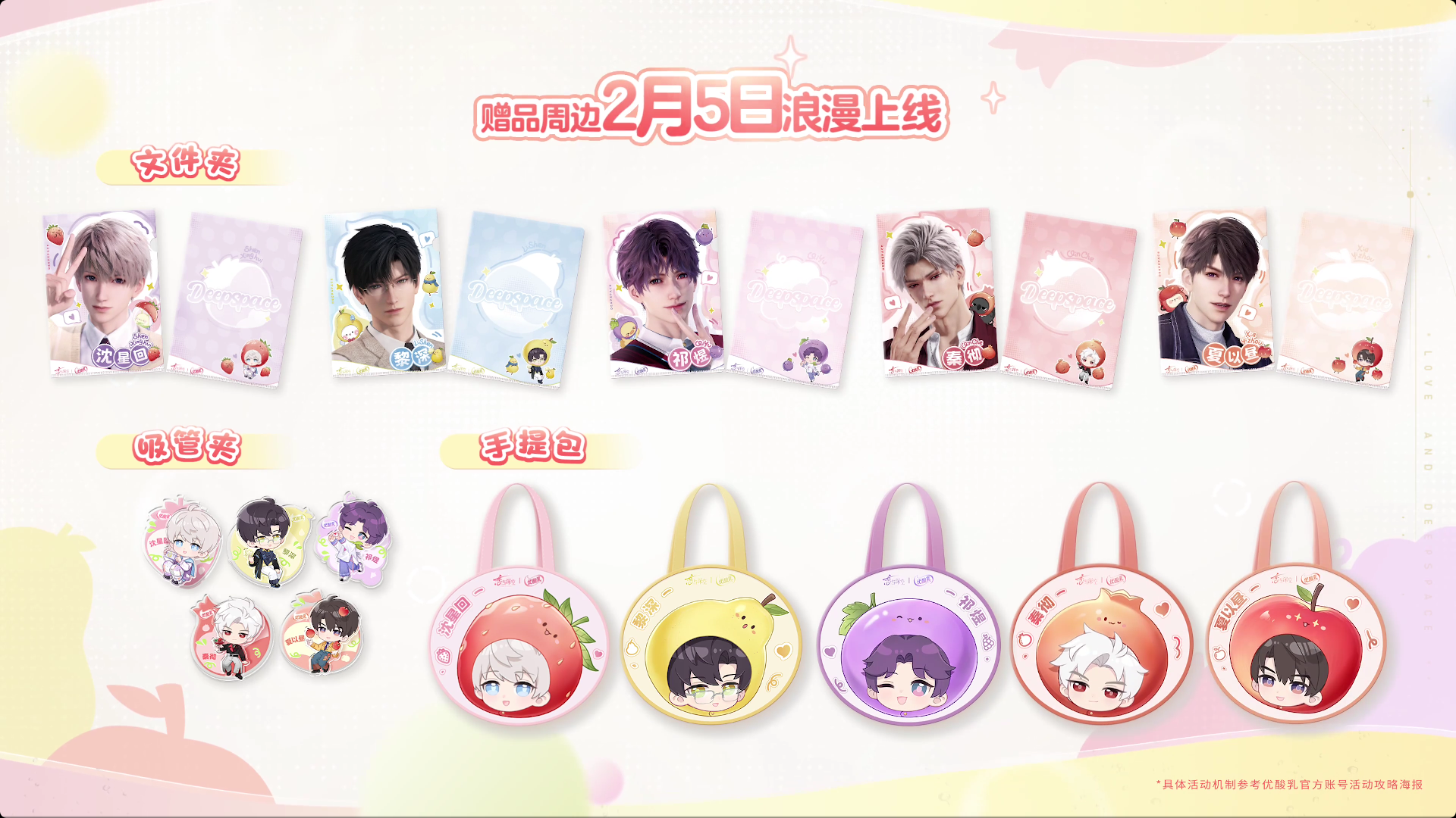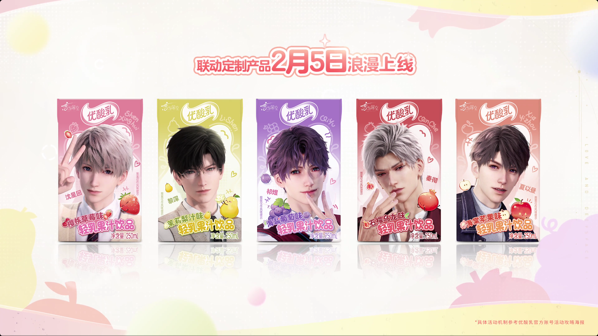 联动共将推出樱桃草莓、茉莉梨汁、海盐葡萄、石榴乌龙、海棠苹果五款新味道,分别对应五位男主在游戏中的代表味道。不仅如此,线上购买产品还将配套角色全套周边,包括手提包、文件夹、吸管夹等。线下各类商超也将采取 32 元/箱或 3 元/盒的定价,搭配满赠随机周边策略,降低消费者尝鲜门槛的同时满足其周边收集欲。