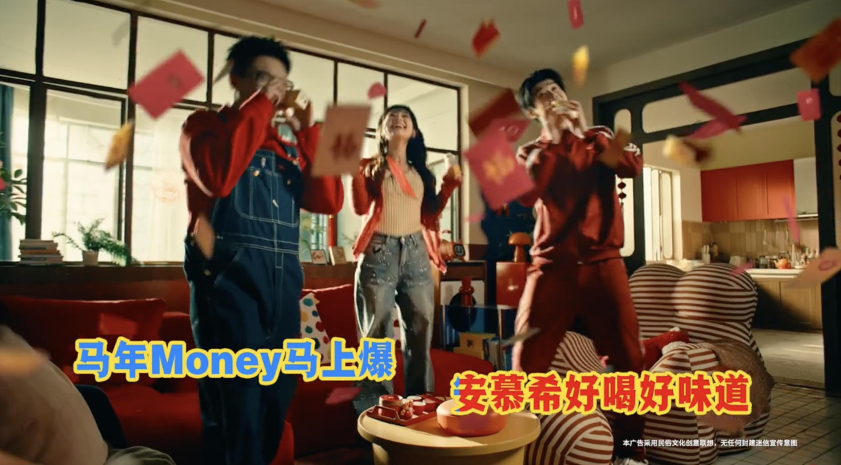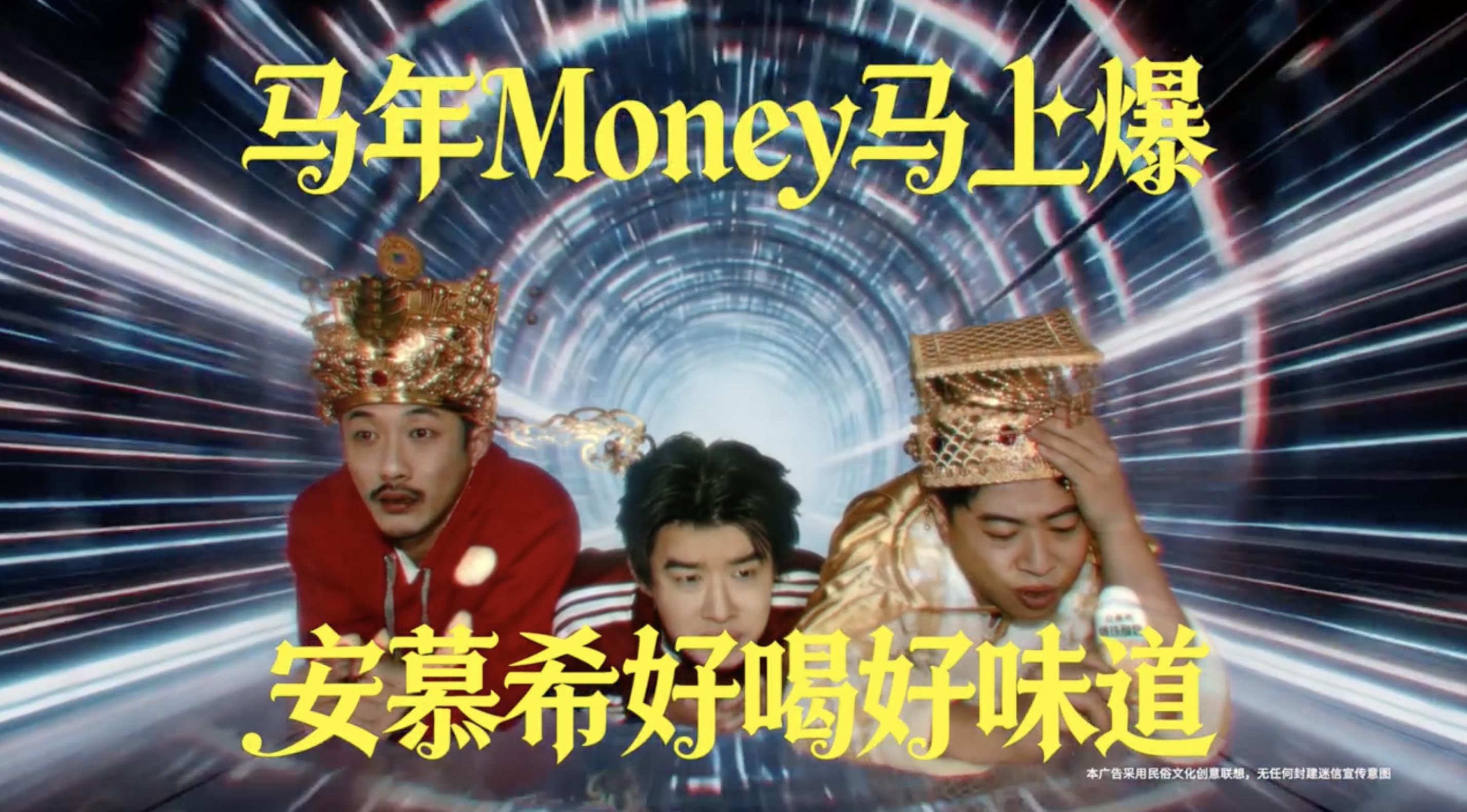 片中谐音梗也玩得邪乎,马年直接变「money」,而那句「马年 money 马上爆,安慕希好喝好味道」的洗脑 slogan,搭配上爆金币、股票大涨、红包炸屏的场面,瞬间点燃年味。而网友也纷纷表示「安慕希夯爆了」、「变成技能安慕希了」,并且纷纷在安慕希的官微下玩起了喜人梗,办起了喜人玩梗大会。