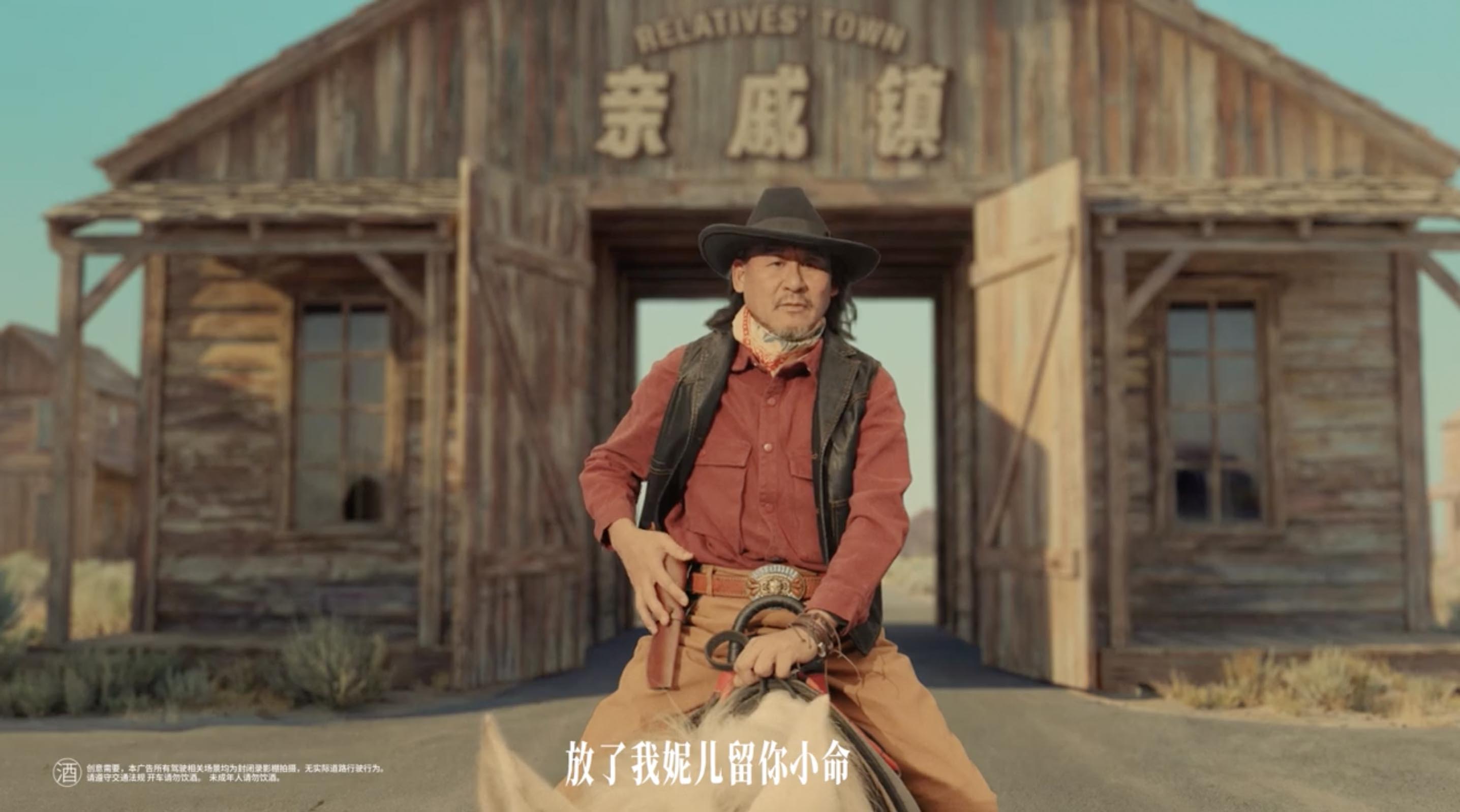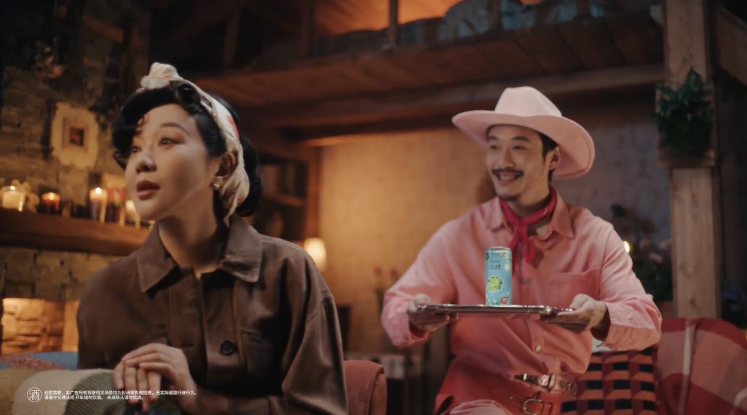 其次,作为近来广告界新晋顶流,张兴朝红得不知天地为何,品牌通常会重复使用老梗和作品形象,但 RIO 则解锁了张兴朝西部牛仔的新形象,既保留无厘头特质,又贴合品牌微醺感。