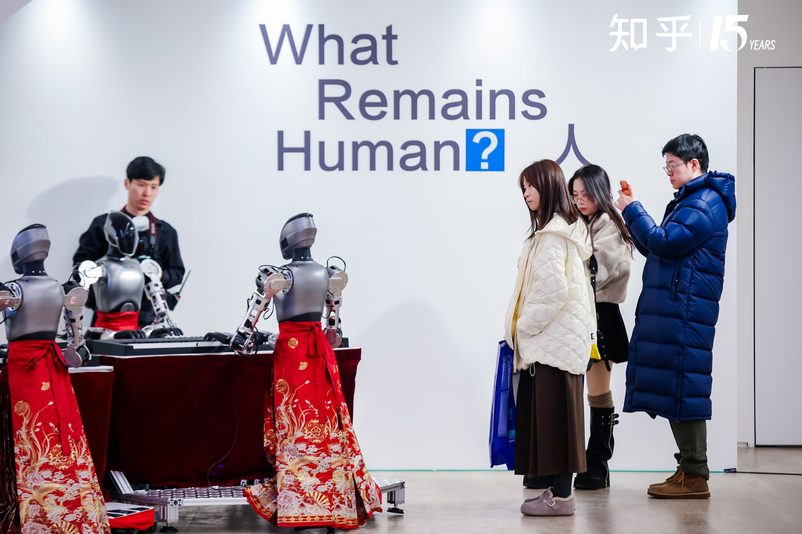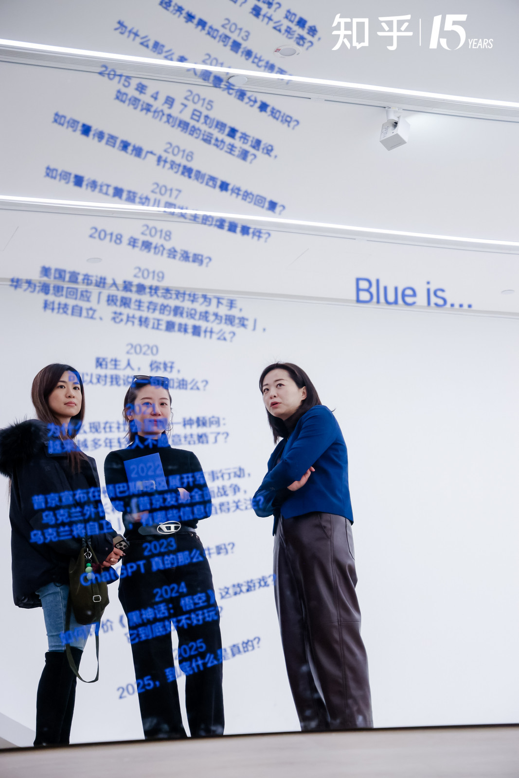 在展览结尾的「Blue is…」部分,知乎发布了 2011 年至 2025 年的 15 个「年度之问」来回望这 15 年。从「博客还有前途吗?」到「到底什么是真的?」,再到涵盖比特币、芯片自立、ChatGPT 等时代热点的问题,既紧扣时代脉搏,也记录了社会变迁与公众思考。