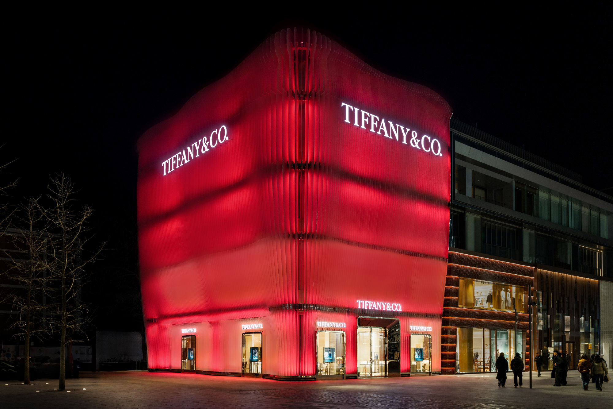 马年新春将至,蒂芙尼首次以「中国红」点亮北京三里屯太古里旗舰店的外立面。这座由 MVRDV 建筑事务所设计的旗舰店,以艾尔莎·柏瑞蒂作品中的流动线条为灵感,当红色灯光铺展其上,鳍片式立面在夜色中层层展开,远望如同一盏被点亮的「红灯笼」,传递着新春的祝福,向中国传统文化致意。
