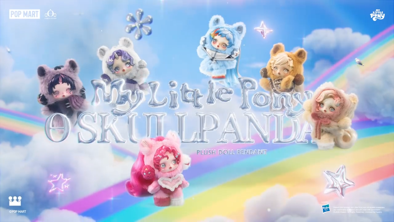 设计采用千禧风潮与彩虹元素,主打毛绒触感挂件,主题围绕「Super Hair Salon」展开,通过发丝色彩魔法呼应小马宝莉的友谊精神,SKULLPANDA 标志性风格与小马宝莉经典形象碰撞,形成「多巴胺迸发的幻想世界」。