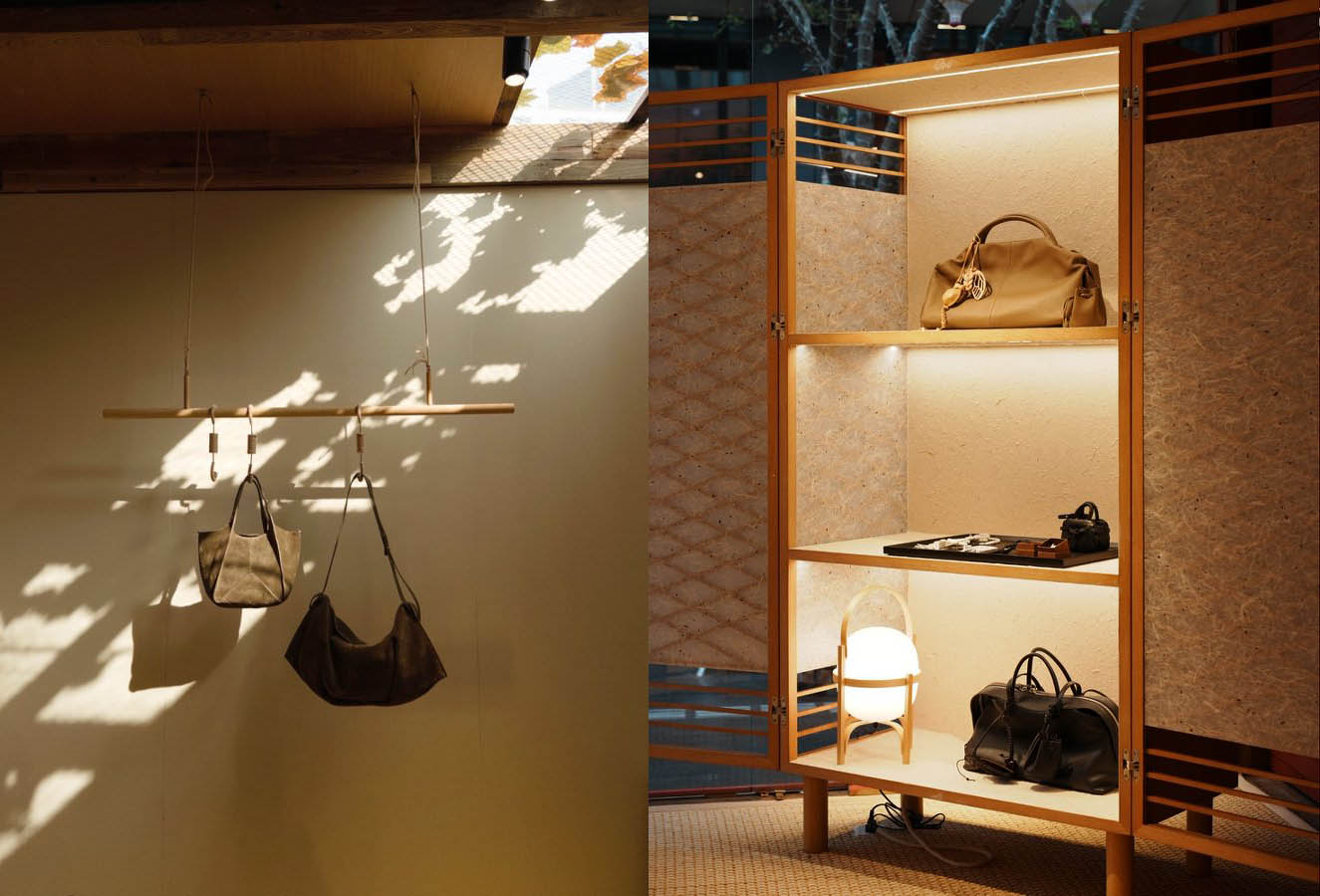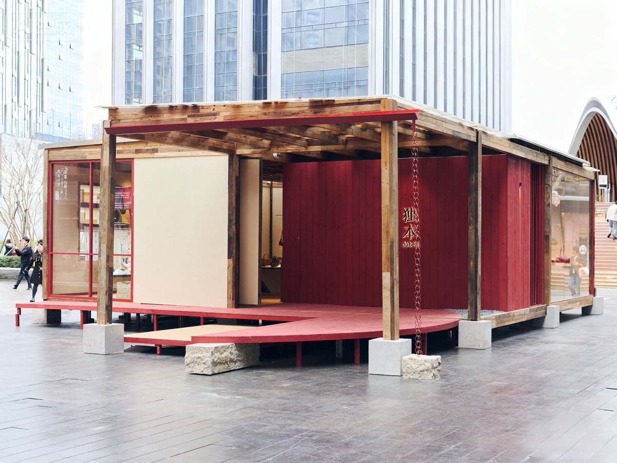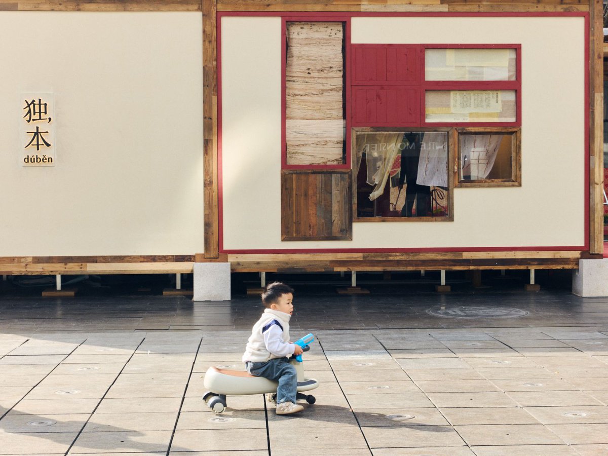 空间以「自然的栖息地」为灵感,采用裸露的木构与榫卯智慧搭建主体框架,大量使用未经打磨的原木、 石材与手工纸等原生材质,构建出质朴而温暖的场景。光影透过顶部落叶装置洒落,在粗粝表面形成流动 的印记,仿佛将时间的流逝可视化,呼应「独本」所倡导的「安放逗号」的生活理念——停顿并非停止, 而是为了更从容地出发。