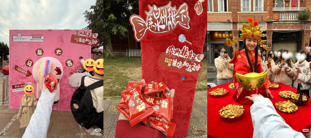 在线下,泉州文旅联合零食品牌,在全城补给 1.5 吨糖果,让游客们在颇具烟火气和趣味性的在地化互动中,最大化泉州本土「甜」味文化的沉淀。「拍马屁」承接马年新春情绪,「寻滴水兽」深化在地文化体验,「财神发甜」创造街头偶遇的惊喜福利。它们共同将一座历史文化名城,转变为一个大型的、可互动的、充满人情味的主题乐园。