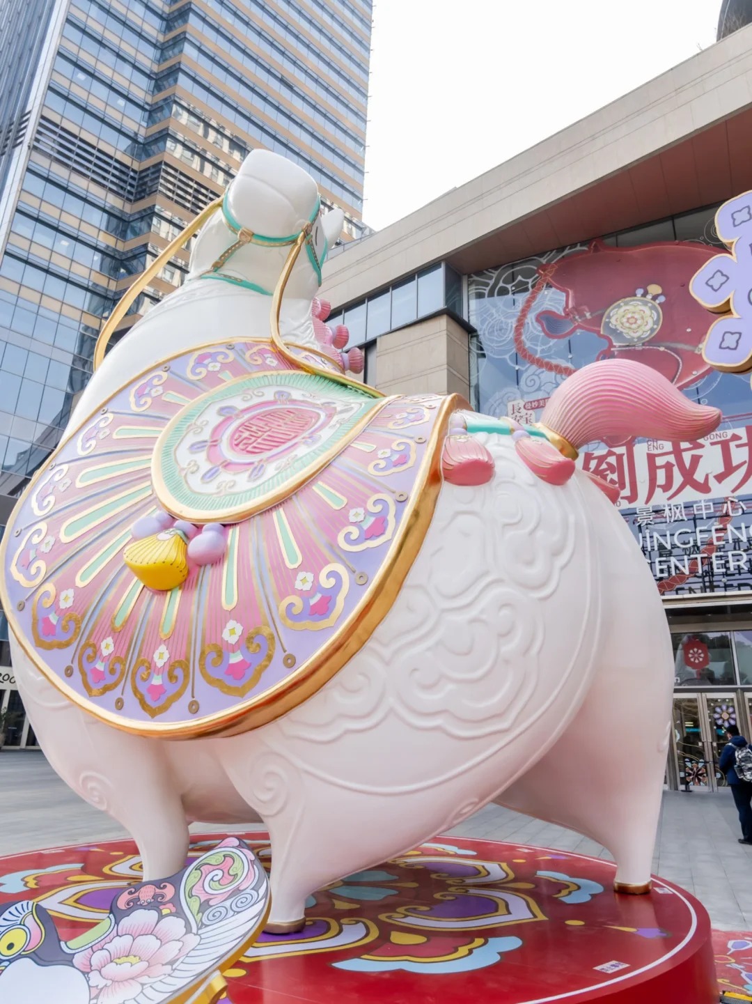 与此同时,景枫也并未将 IP 局限于静态美陈,而是将其化作一种「空间语言」,在商场各处埋下了超过 100 个含「马」彩蛋:从大门口倒贴的「马到成功」,到玻璃门上的「紫马开门」,再到洗手间马桶上方的「马桶祝你马年快乐」,甚至商场外的石墩子也穿上了专属「外套」,变身可爱的「马屁墩子」,以一种轻松幽默方式完成了对「马」的多元解读。