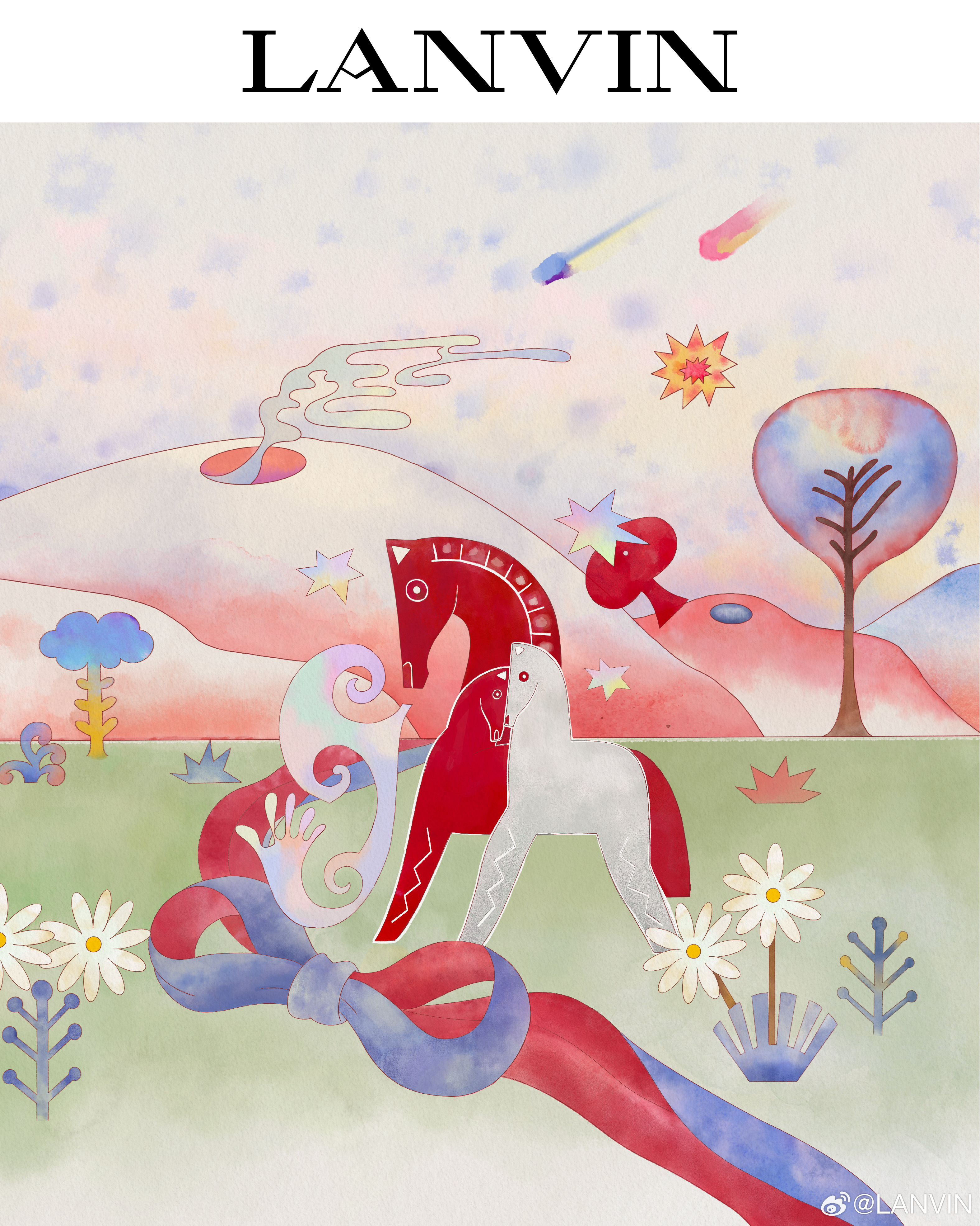 在此基础上,Lanvin 与艺术家共同呈现主题动画及橱窗装置。动画中融入品牌标志性的浪凡蓝、雏菊与缎带等经典元素,陪伴马儿一家在春日海浪间前行;橱窗部分,吕文婷以「马之气息」为灵感,打造灯笼装置与苗绣挂毯。