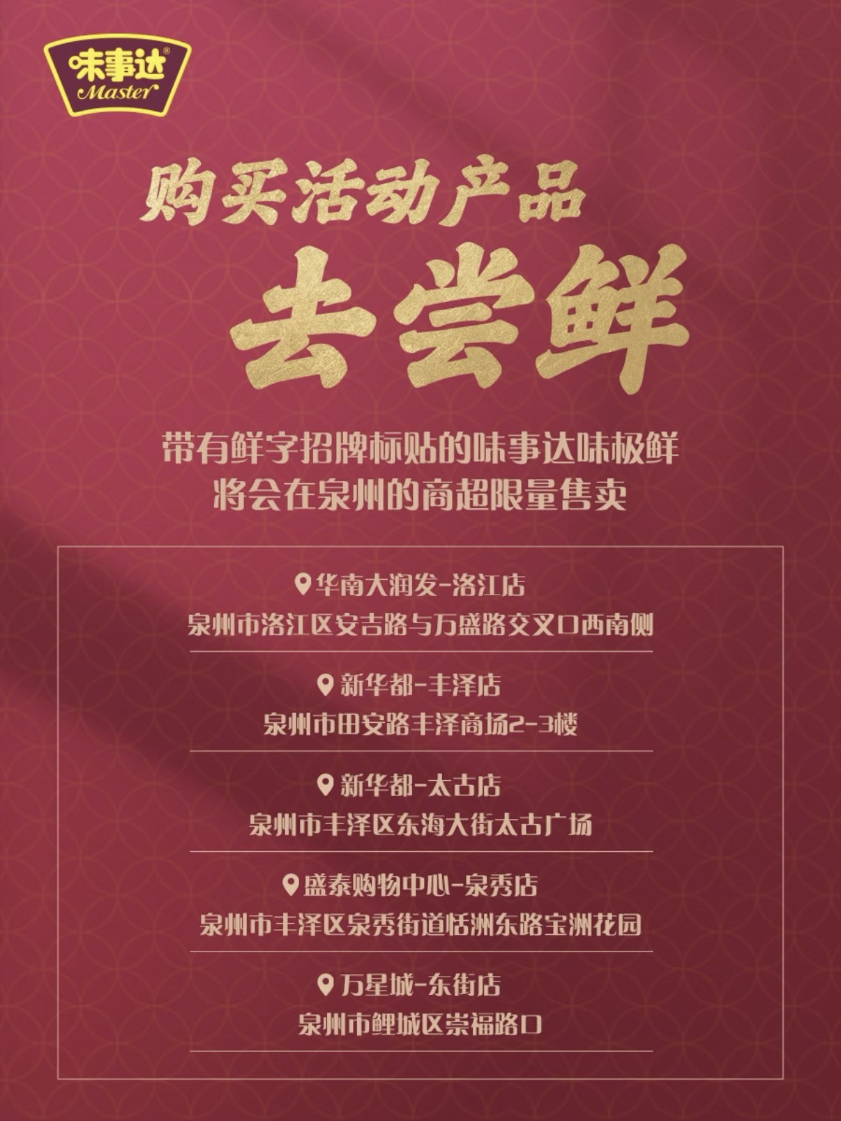 味事达将目光投向了泉州,这里的许多海鲜酒楼数十年如一日地把「鲜」字刻进店名与招牌。为此,品牌把产品包装变成了老店的「移动招牌」,把多家泉州餐厅沿用多年的「鲜」字原样复刻于味事达味极鲜酱油的瓶身,让每一瓶联名产品都承载着一份真实的鲜味承诺。