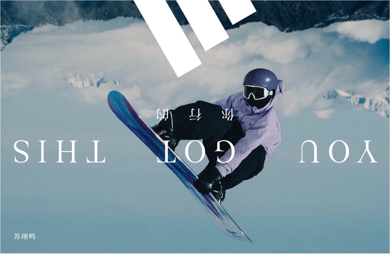 上下颠倒的文字不仅是一种创意,更是在空中翻转的苏翊鸣眼中的视角,这一设计不仅巧妙呼应其在赛场上完成的高难度翻转动作,更深层表达祝愿「苏翊鸣再一次翻天覆地,超越自我」; 也不断对运动员以及更多人诉说着品牌的精神:「YOU GOT THIS」你行的!