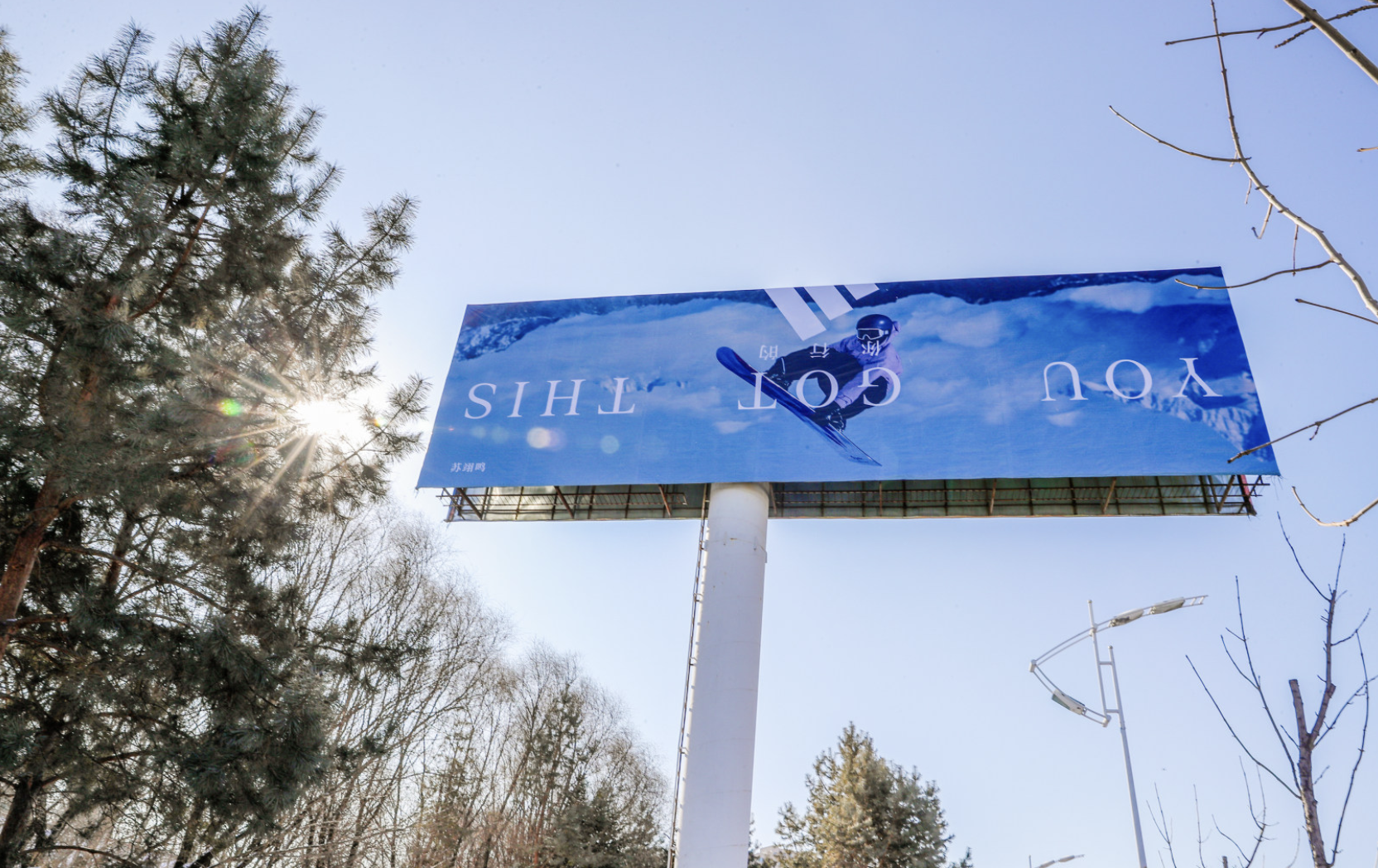 本次adidas首次将标志性品牌 logo 与「YOU GOT THIS」倒置翻转使用,将于 2 月 7 日在苏翊鸣家乡吉林率先投放创意广告牌,adidas 用突破常规的创意,在最「对」的地方,以最特别的方式,展现对他的祝福与支持。