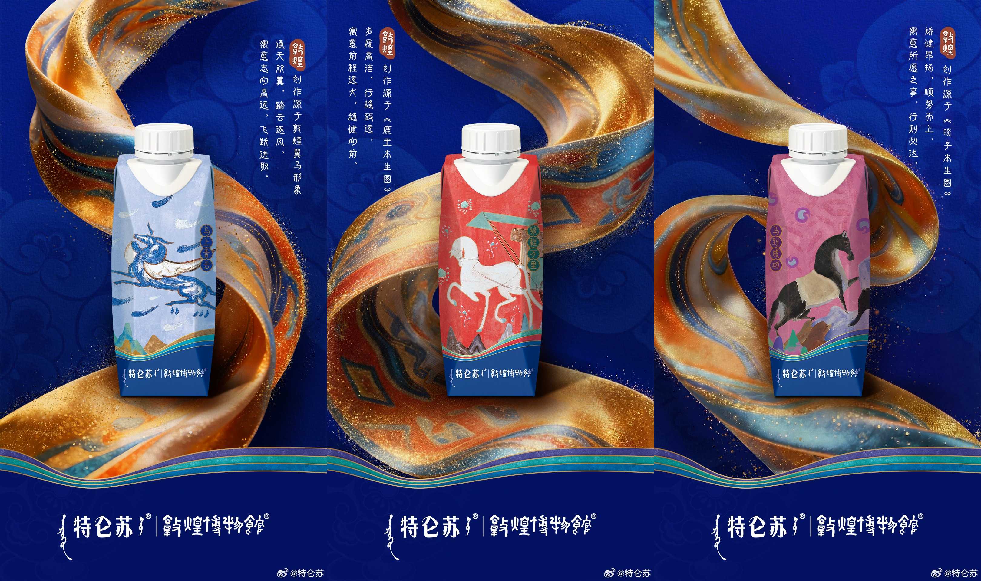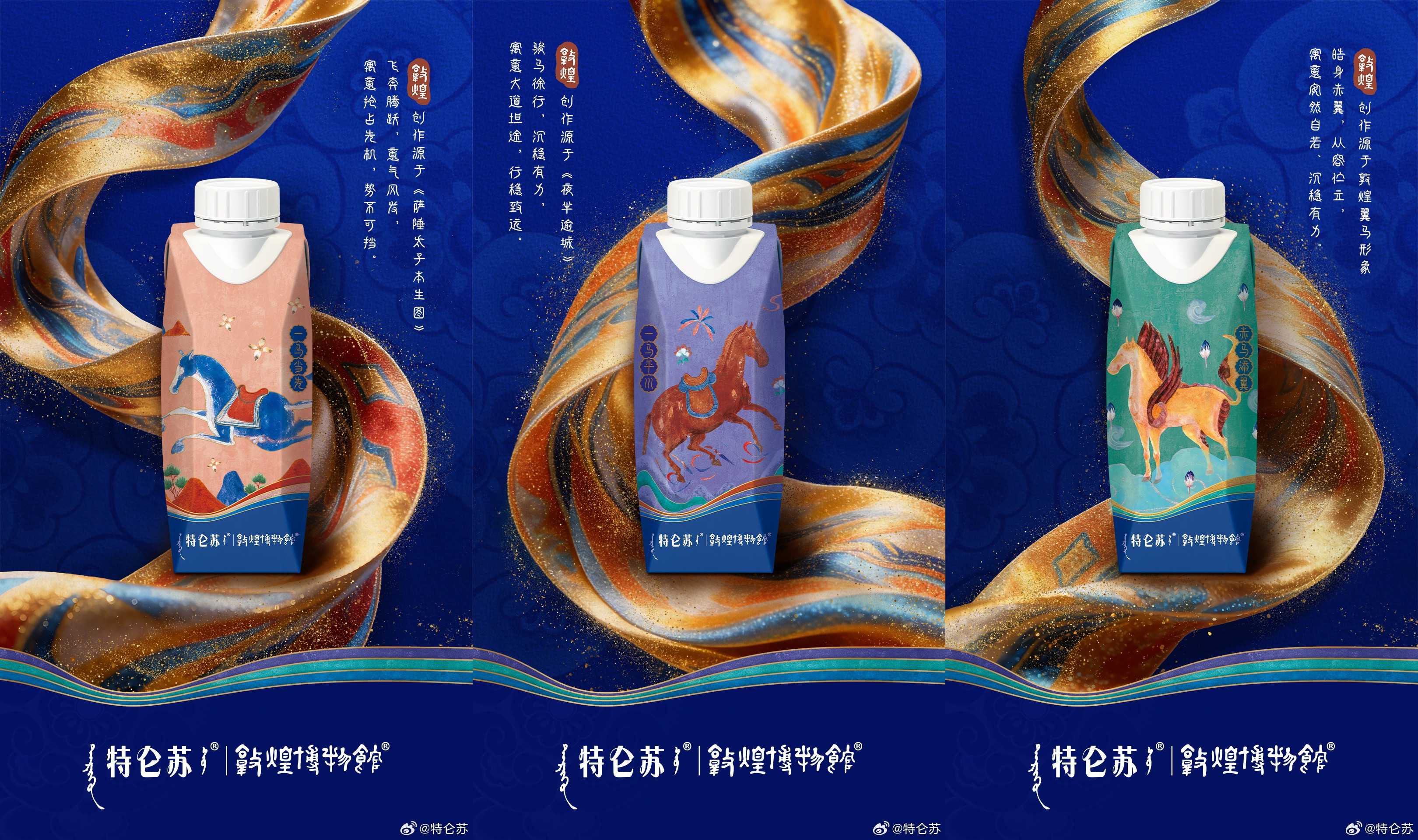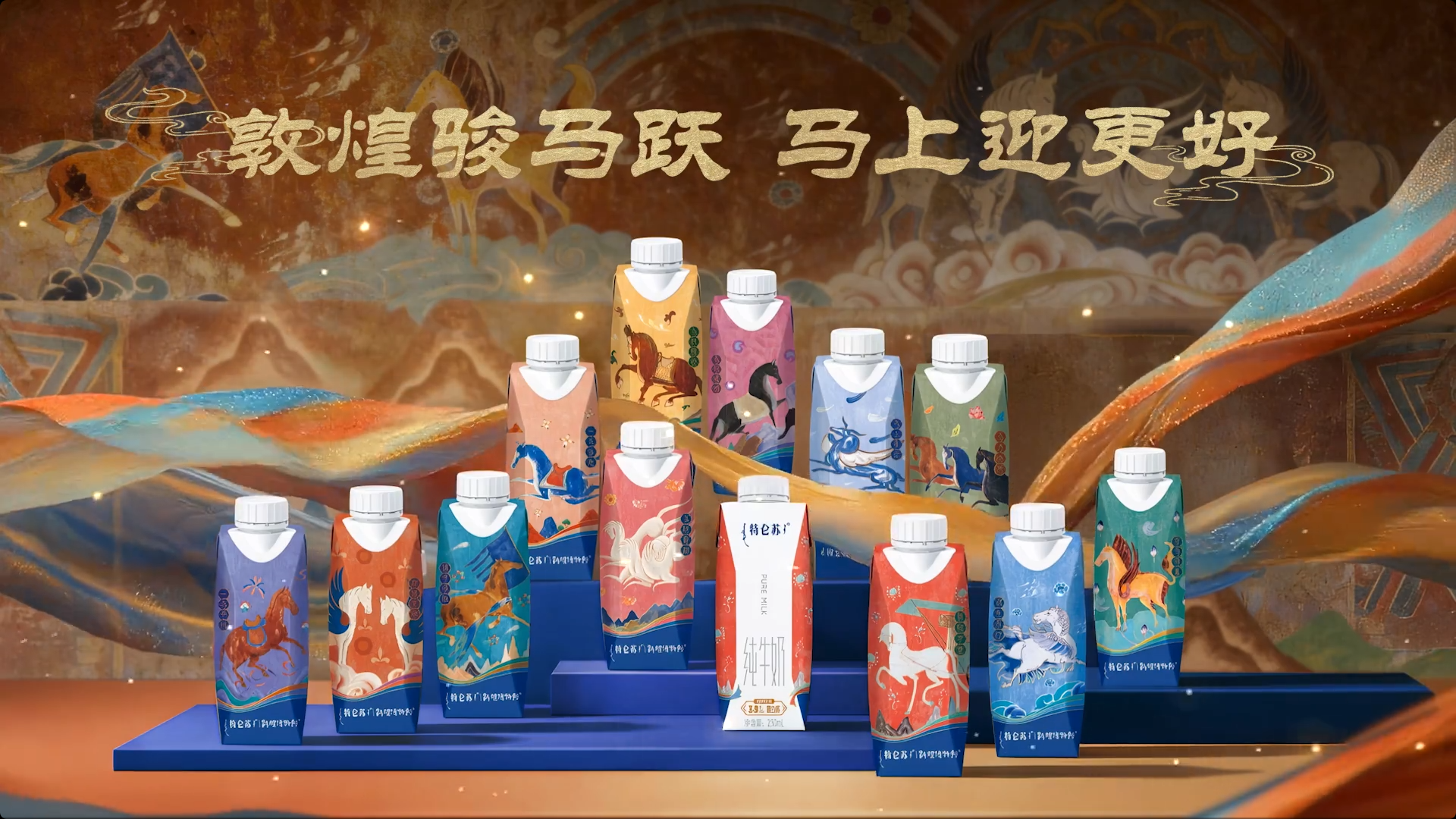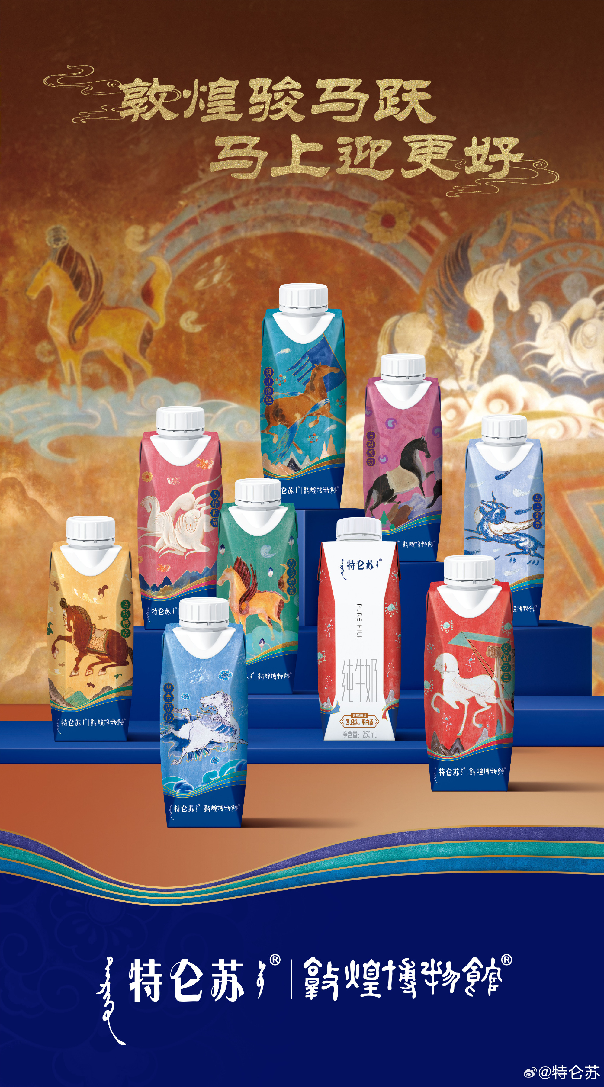 「丝绸西去,天马东来」。敦煌像一个巨大的容器,承载了千年的交汇与流变。而一代代守护者,就像驮经马,虽然走得慢,但步履不停。在时间的永恒流逝中,守住了那份原生和纯粹。未来迎接即将到来的马年,特仑苏也联合敦煌博物院推出了新年限定款包装,将敦煌飘逸的天马、俊朗的战马,还有那低头前行的驮经马……都印在包装上,希望它们能和特仑苏一起,在这个新年进入千家万户。