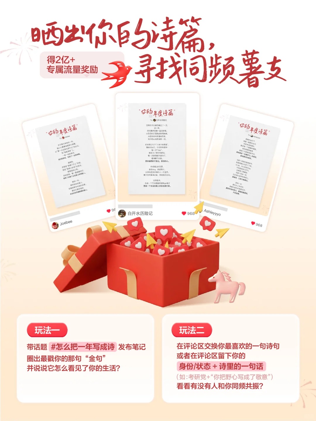不仅如此,平台还配合发布 #怎么把一年写成诗 相关话题,用户只需生成诗篇、摘录金句并发布笔记,即可参与瓜分 2 亿流量池。截至 2 月 17 日,相关笔记已超 18 万条,多篇内容登上热搜,共同完成了新年的第一场诗意传递。[SocialBeta]