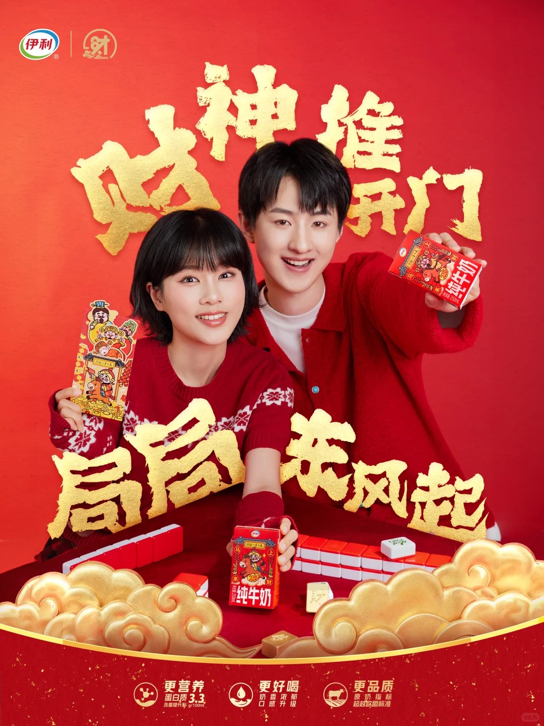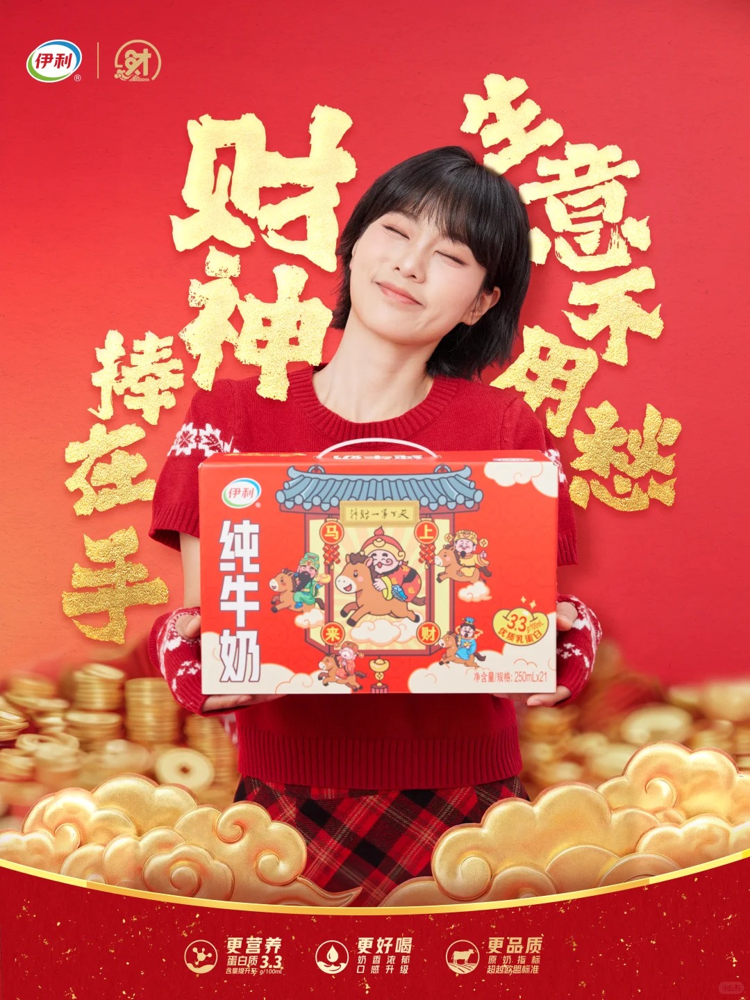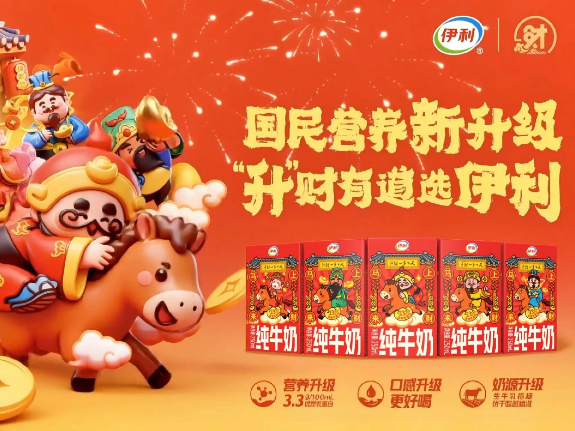 产品端,伊利与天下第一财神联名,带来五款财神牛奶,拉满财气。同时品牌还推出「财神抱富桶」周边礼盒,包含贴纸、香囊等主题赠品。