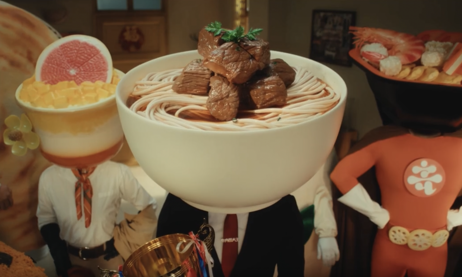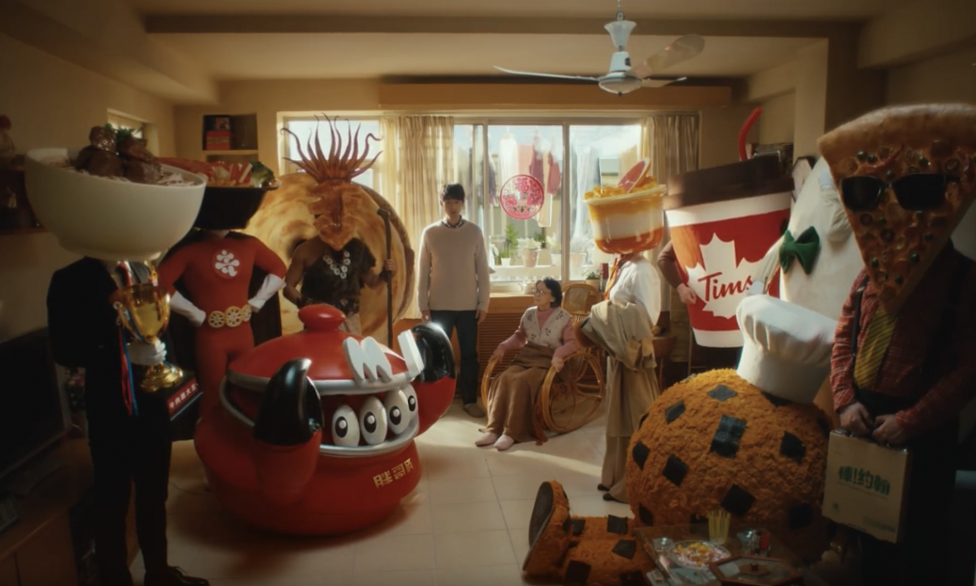 主角张小强回家过年,奶奶问:「一个人在外面,很辛苦吧?」他笑着回:「我在外面朋友挺多。」然后像报菜名一样念出那些名字——沪上阿姨、胖哥俩、李先生、棒约翰。结果下一秒,这些「朋友」穿着蟹堡、奶茶杯、牛肉面碗的夸张造型就登场了。